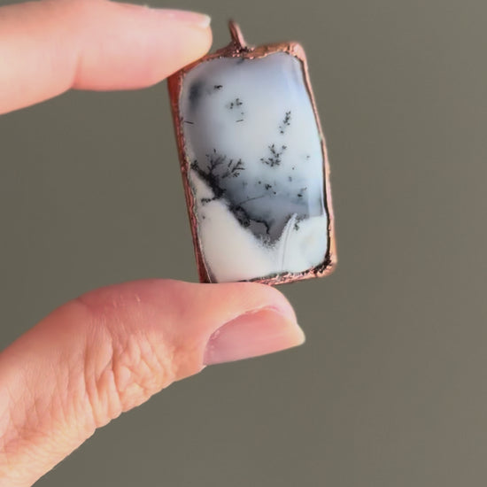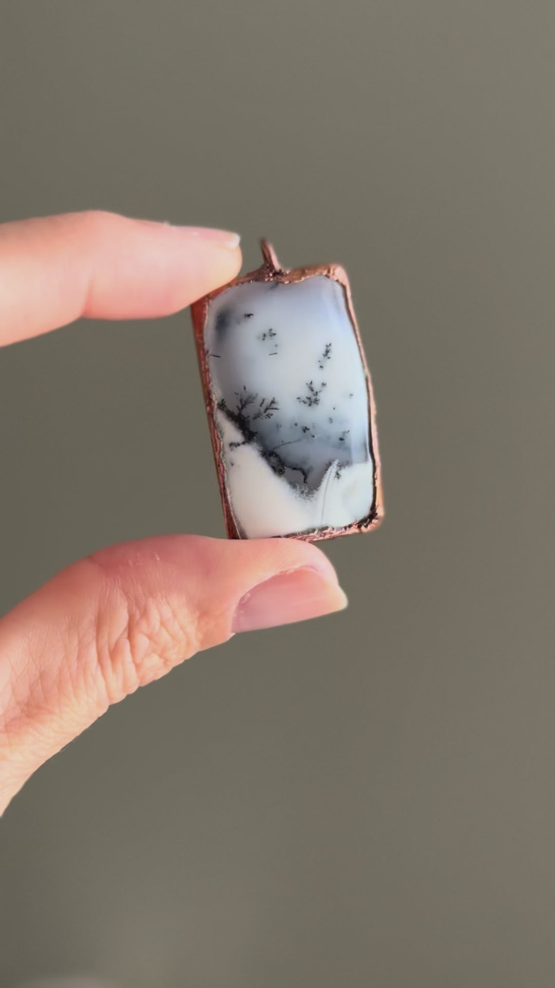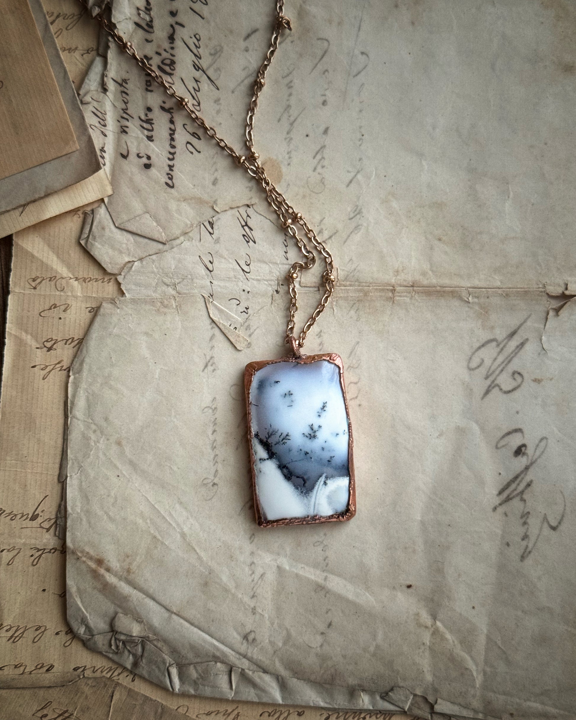 Dendritic agate pendant in shades of white, gray, and black, with its distinctive veining that creates a small, snowy, foggy landscape. The stone measures 20 mm wide and 38 mm high, framed by a handcrafted burnished copper border, as simple and textured as an antique frame.