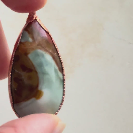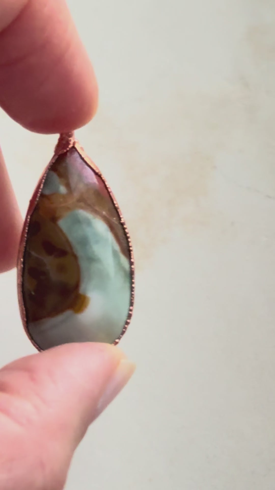 The stone measures 17mm wide and 36mm high, framed by a hand-crafted polished copper border.