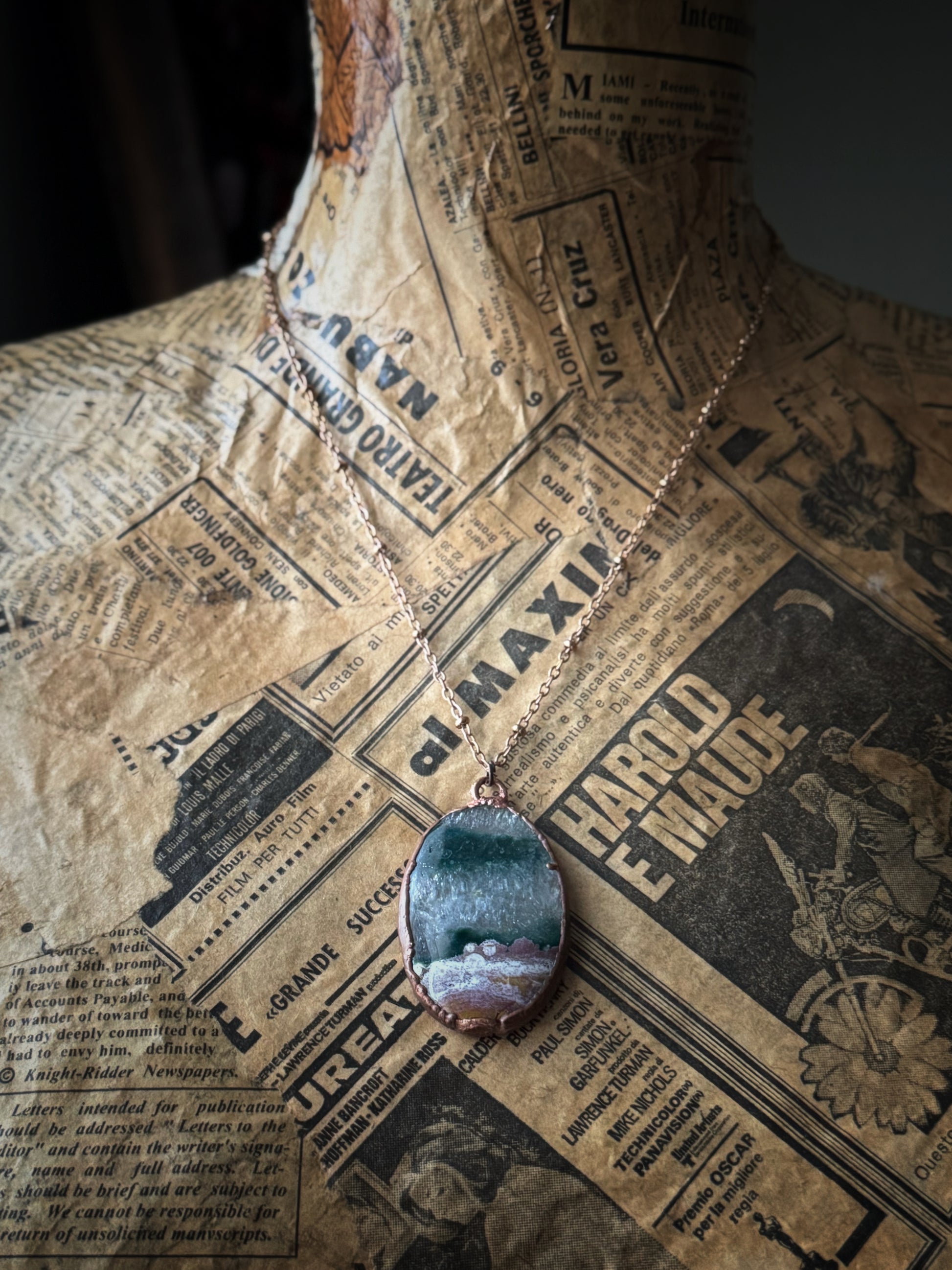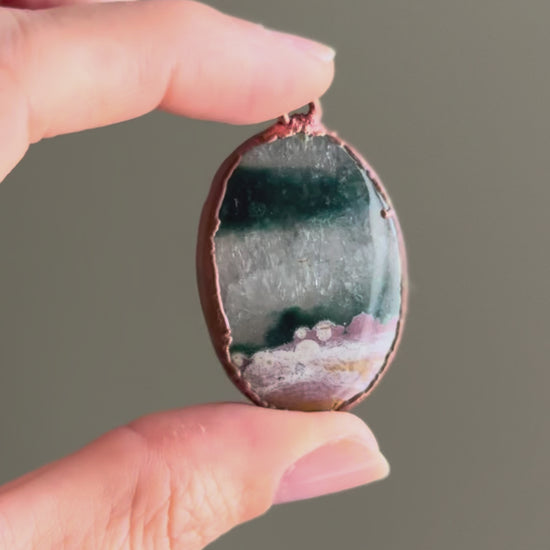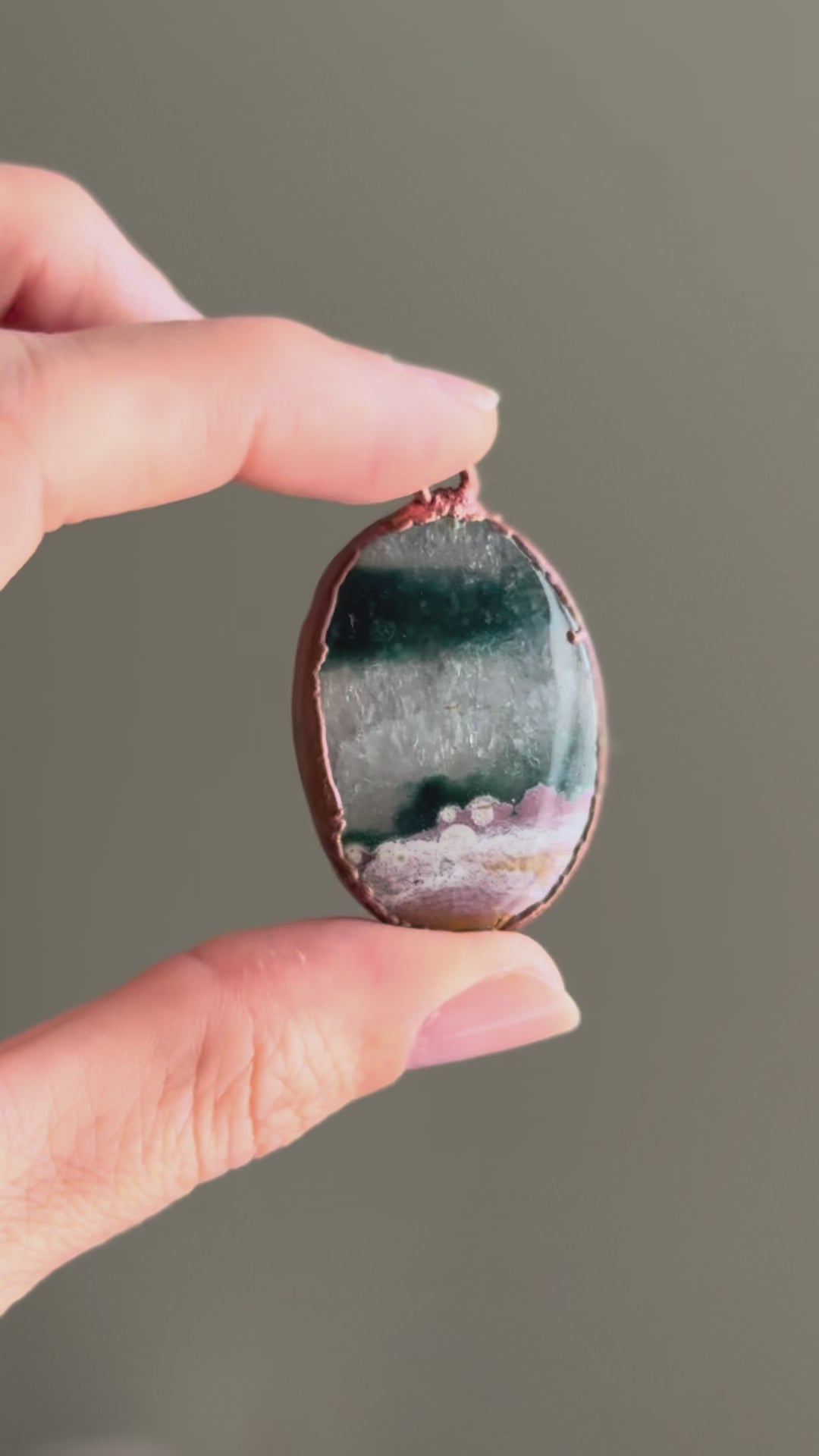 Moss agate pendant with mossy and crystalline layers. The oval-shaped stone measures 28 mm wide and 44 mm high, framed by a hand-crafted burnished copper border, simple and textured like an antique frame.