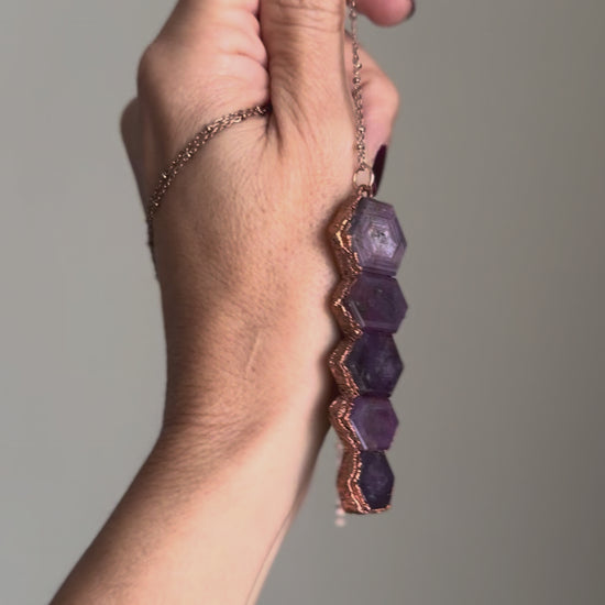 Each slice retains the rough veining of the original stone, with shades ranging from deep lilac to wine red, made even more intense by the contrast with the copper.