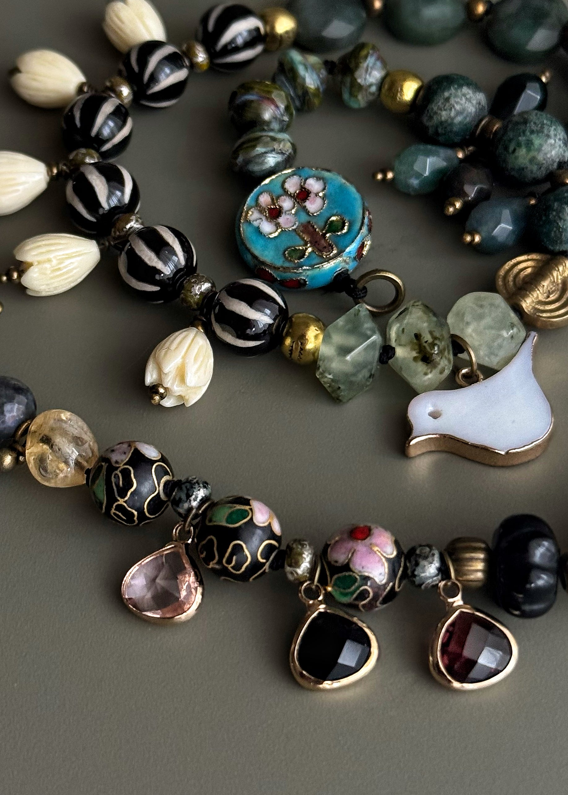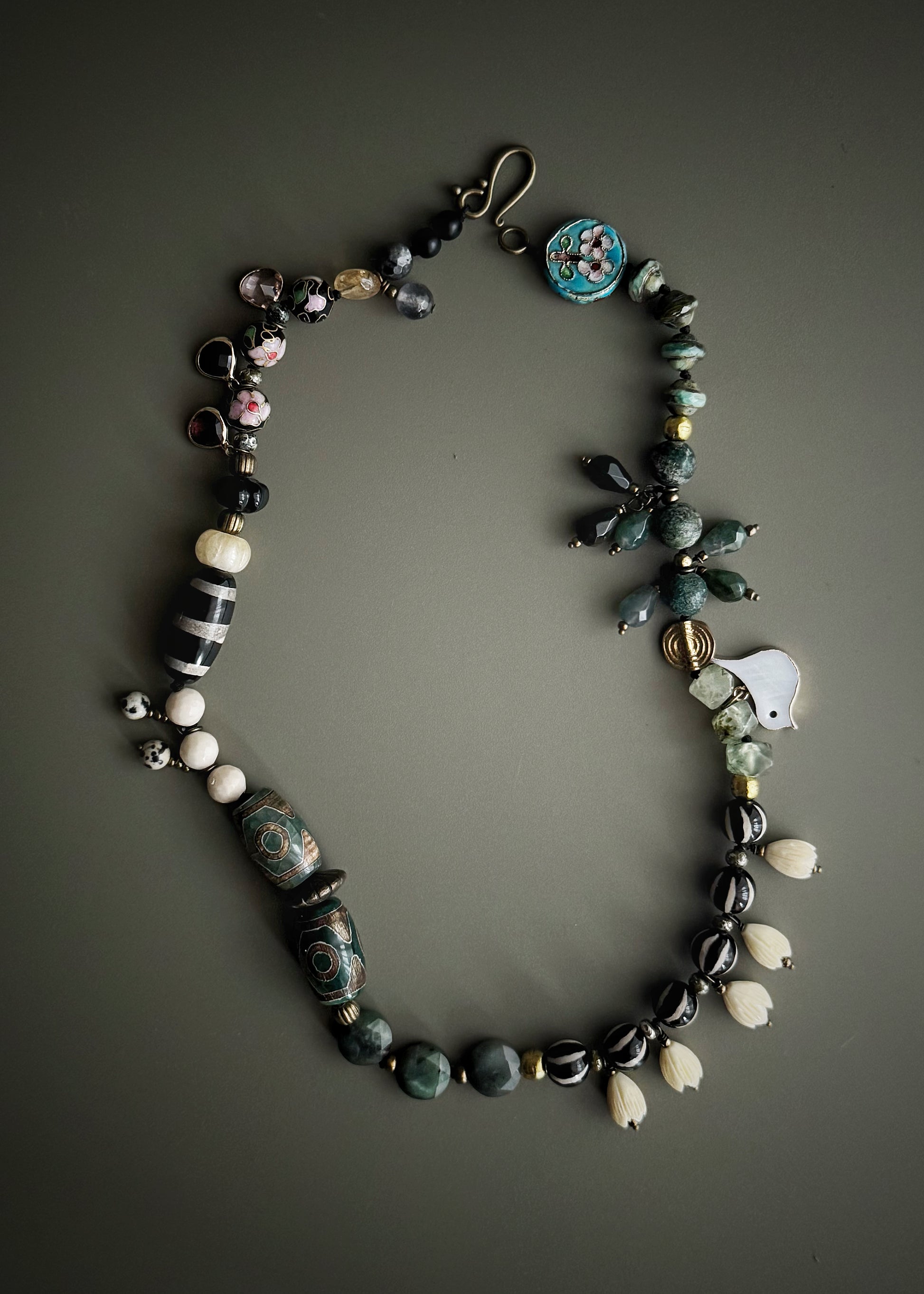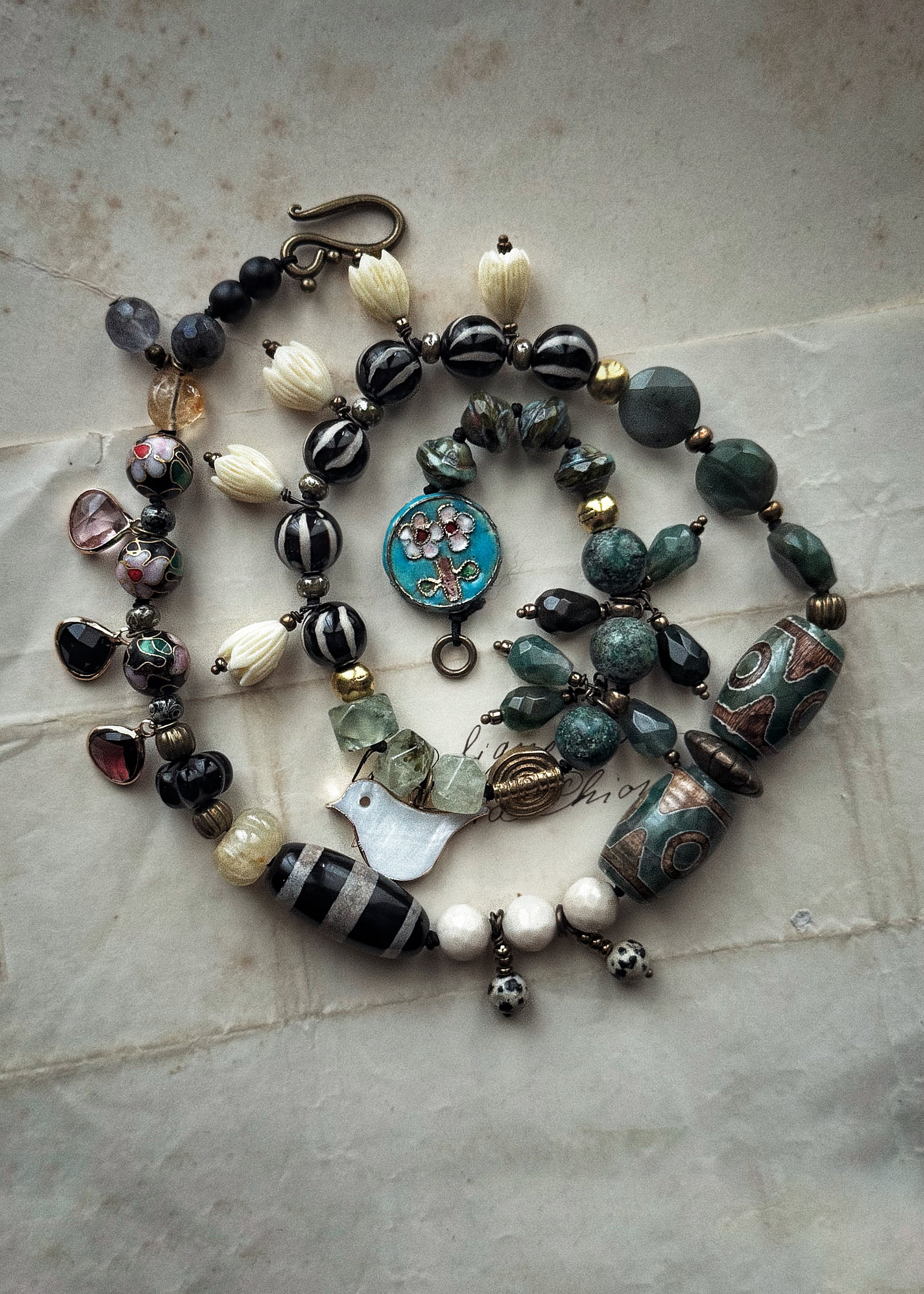 The composition alternates Dai agate, moss agate, African turquoise, Bohemian glass elements, cloisonné pearls and small pendants: moss agate drops, synthetic coral flowers and a delicate mother-of-pearl bird, which adds a poetic accent without being overly decorative.