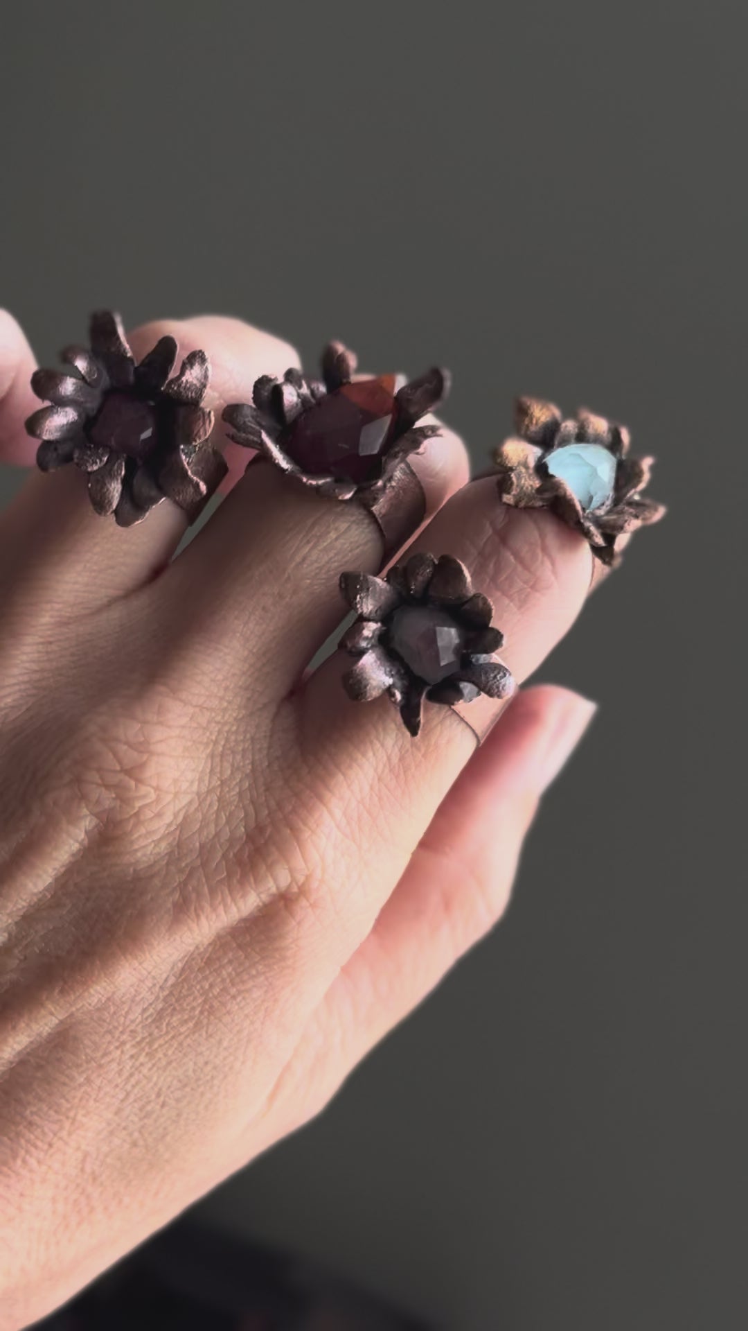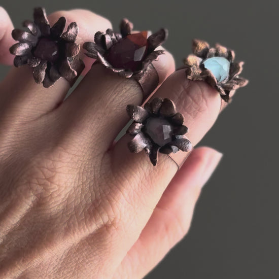 Anelli a forma di fiore realizzati e placcati in rame con petali sottili ed una gemma centrale