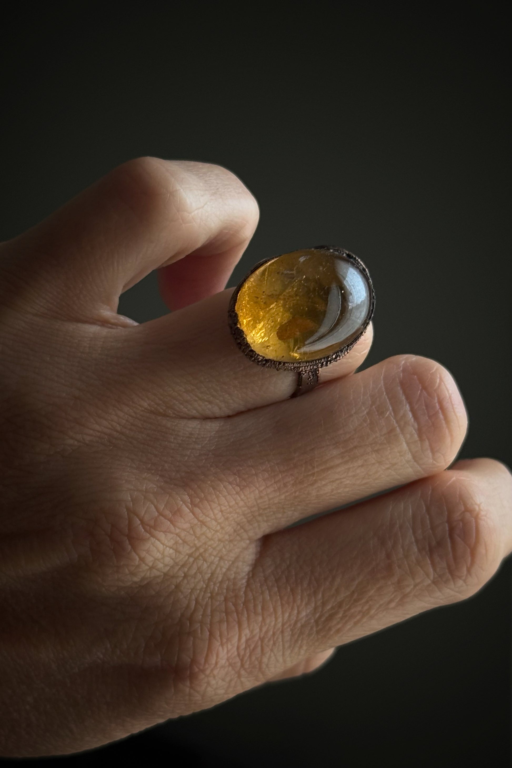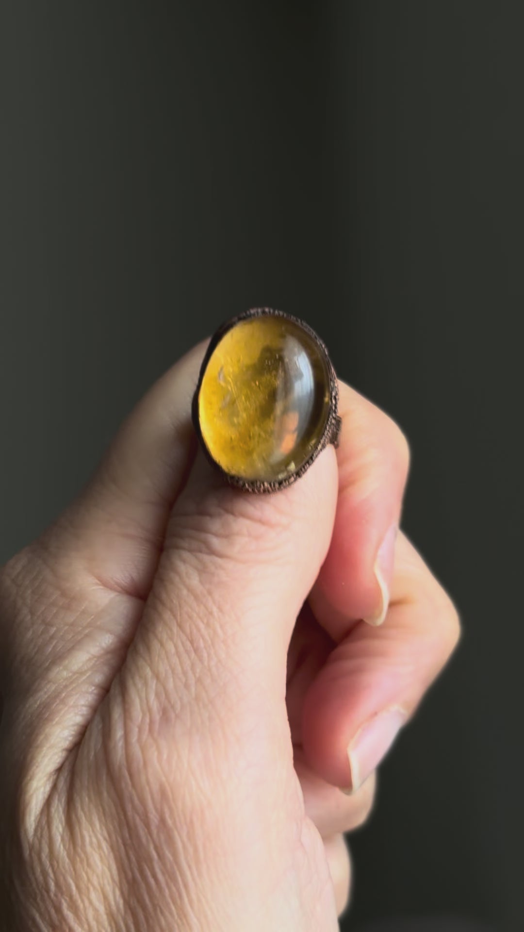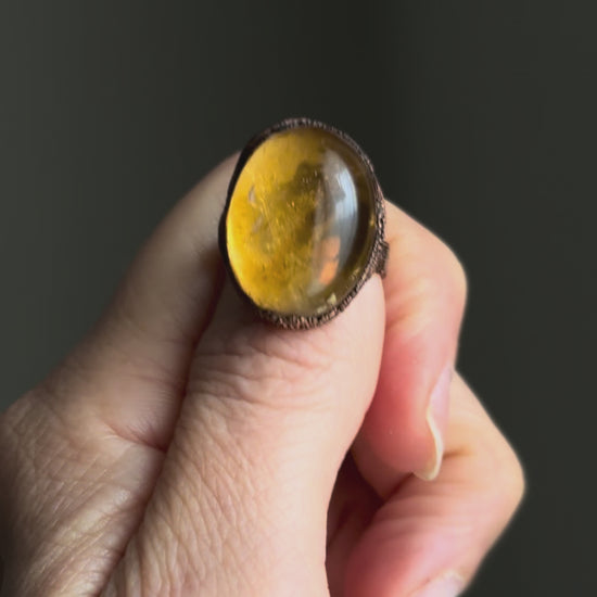 Una singola, grande pietra di Quarzo Citrino cattura la luce con il suo vibrante colore mielato e caldo, incastonata nel rame con una montatura essenziale che ne esalta la forma ovale (24 x 15 mm spessore 1 cm). La gemma si presenta con una trasparenza cristallina e sfumature che evocano l'energia del sole e dell'ottimismo.