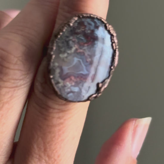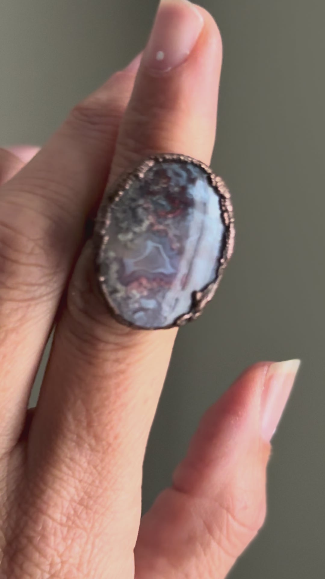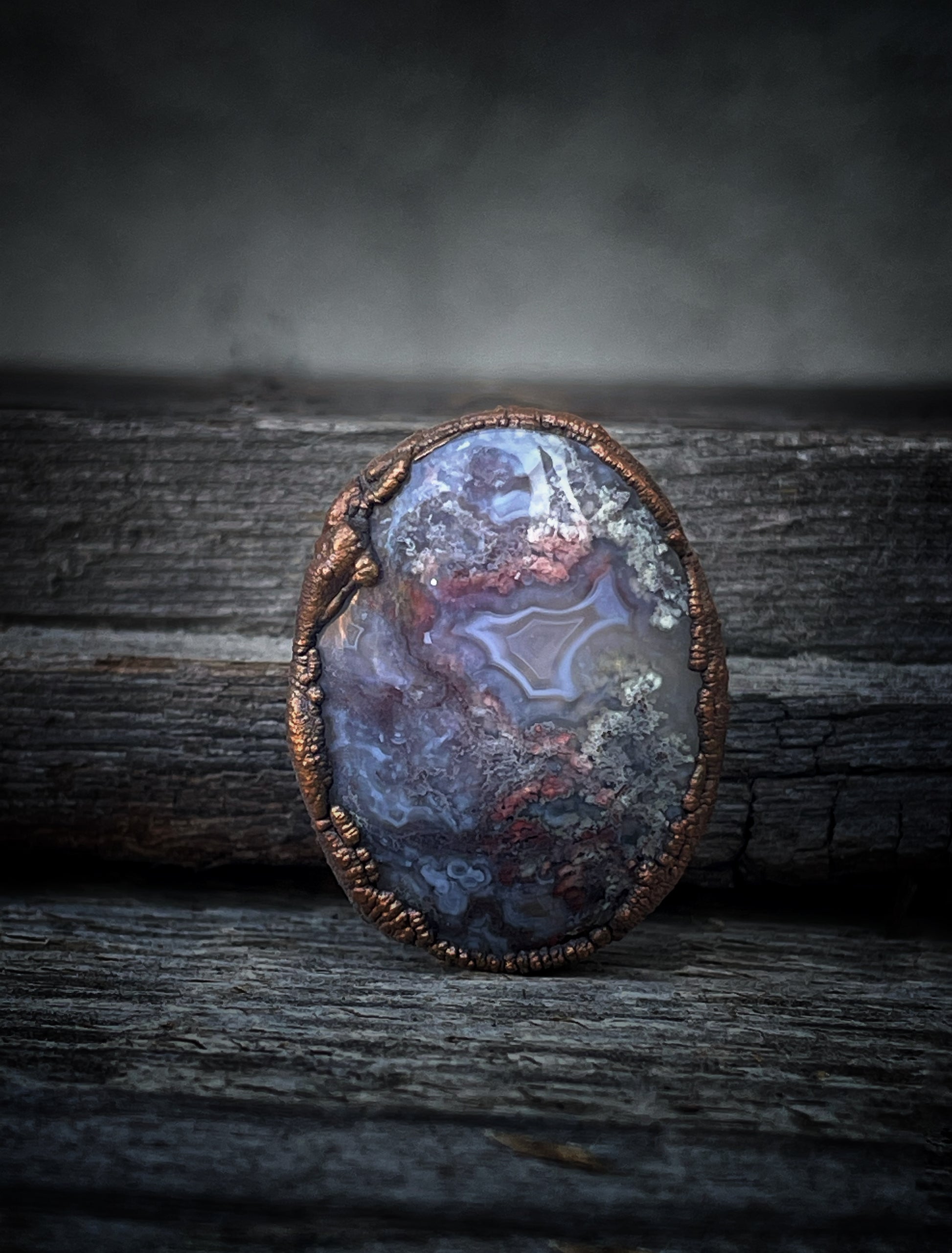 Una gemma naturale che sembra racchiudere un piccolo paesaggio terrestre: l’Agata Muschio presenta inclusioni dendritiche che ricordano radici, licheni e foreste sommerse. Le sfumature spaziano dal grigio azzurro al verde muschiato, con venature color rame che si fondono armoniosamente con la montatura metallica.