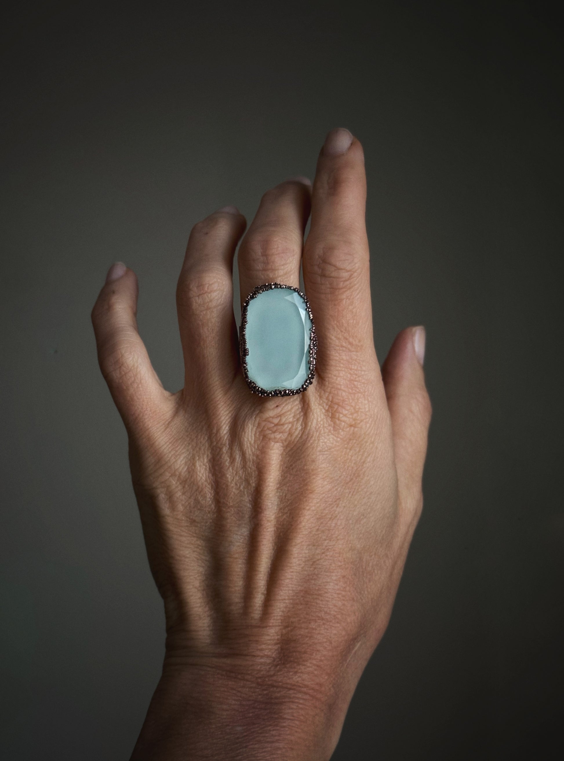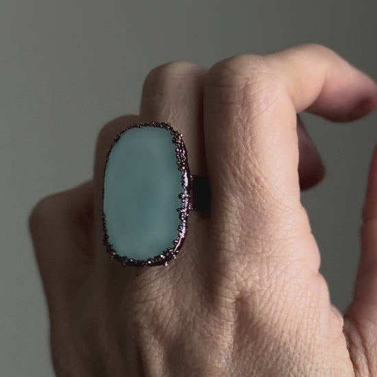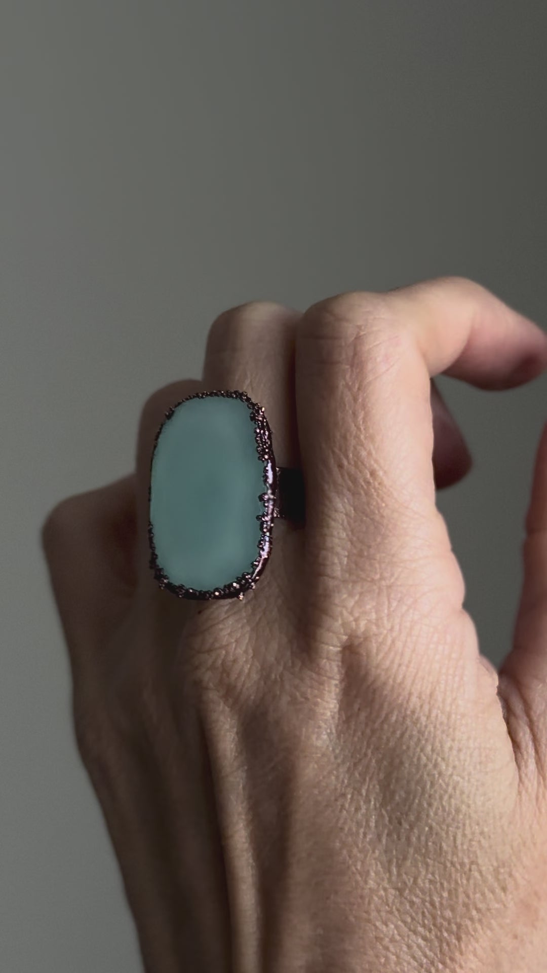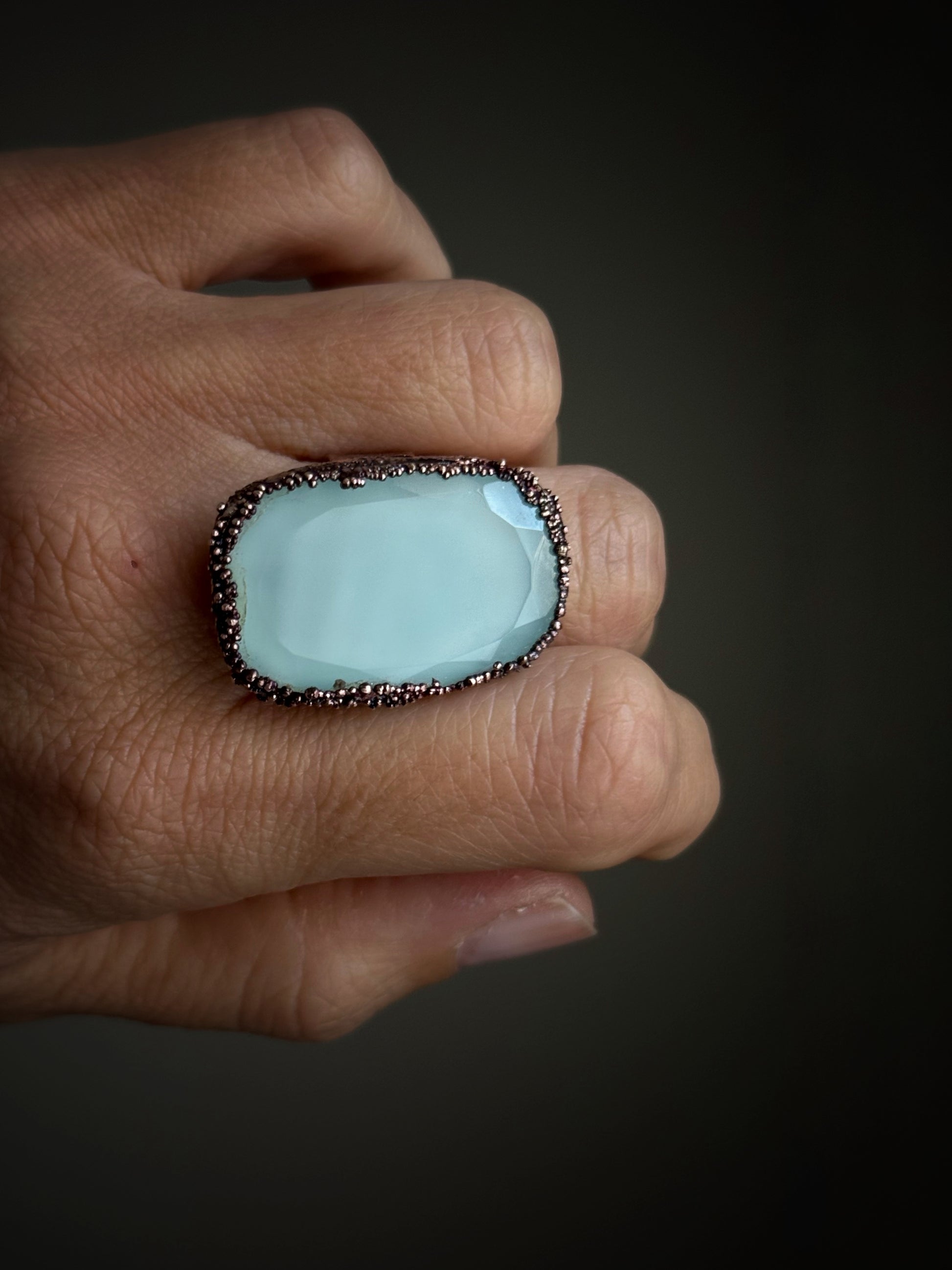 Anello artigianale in rame brunito con calcedonio naturale - Un gioiello delicato che celebra la bellezza eterea del calcedonio.