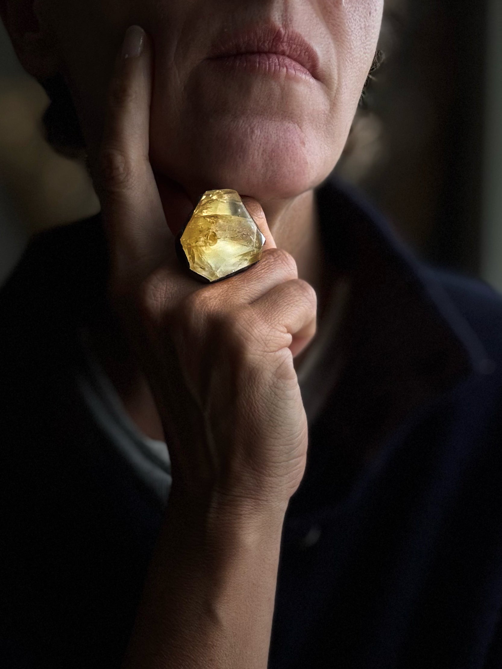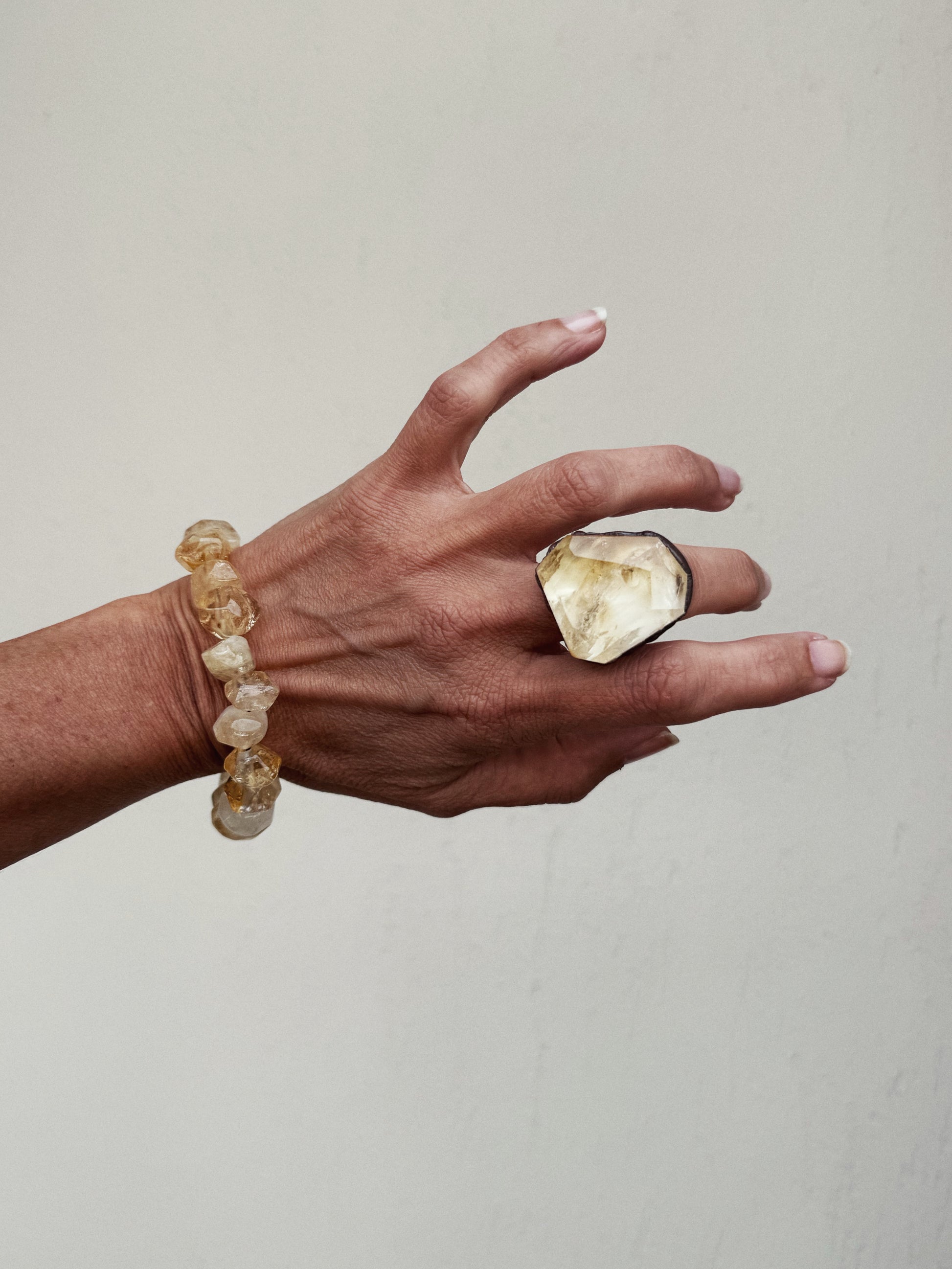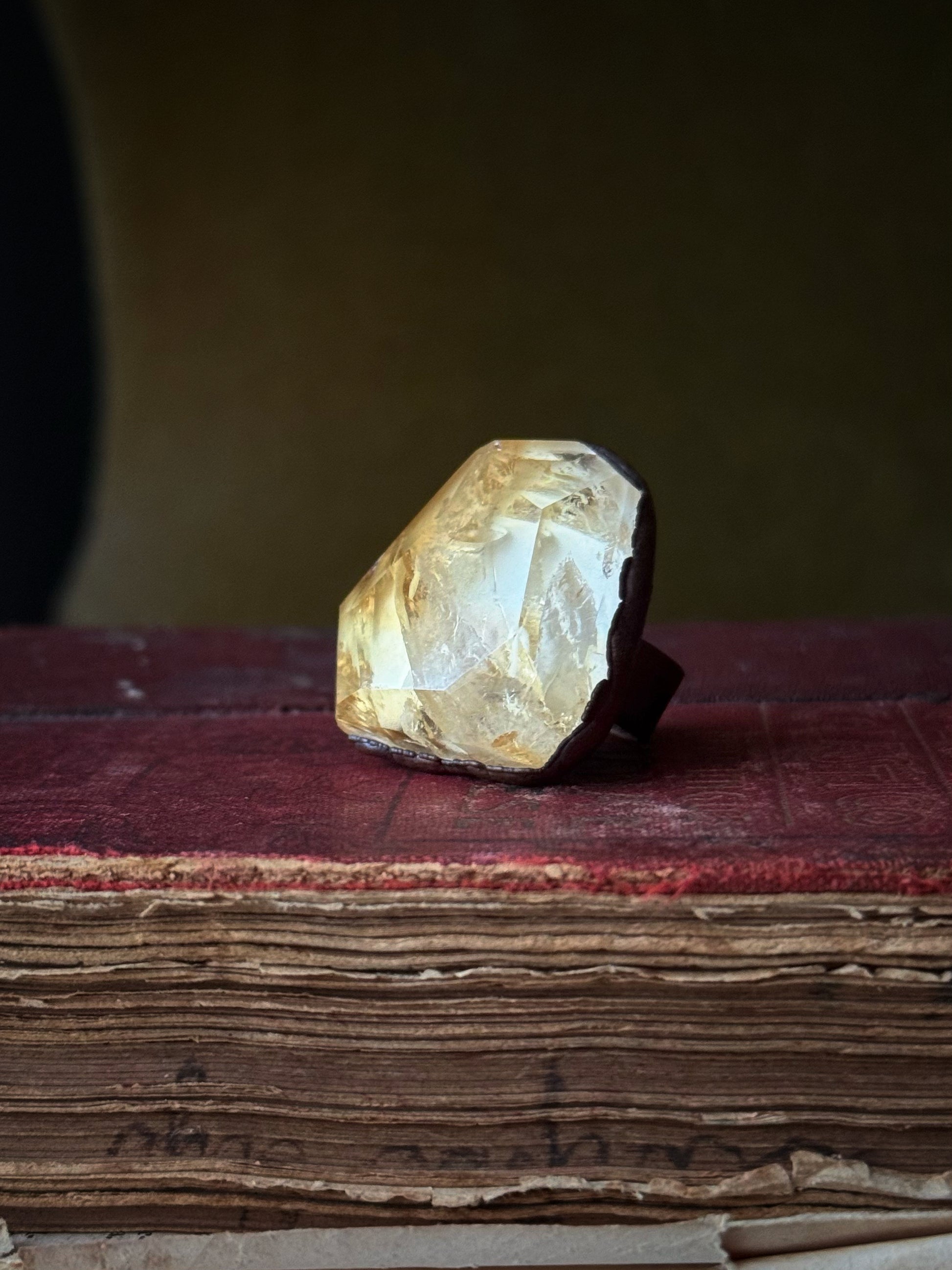 Il citrino è una varietà di quarzo caratterizzata da un colore caldo che va dal giallo paglierino al dorato intenso. In questo anello, la pietra è stata sfaccettata a mano, esaltando la trasparenza e la brillantezza naturale, catturando la luce in ogni angolo e rendendo ogni anello unico.