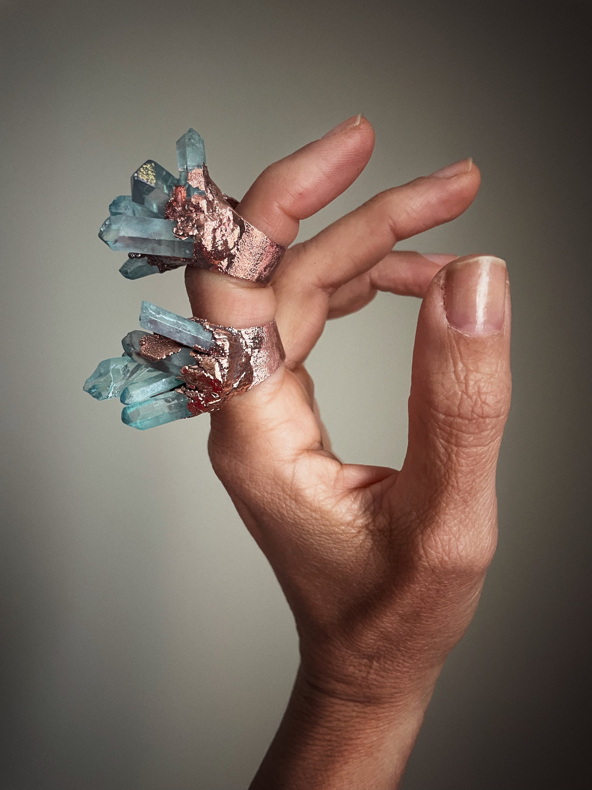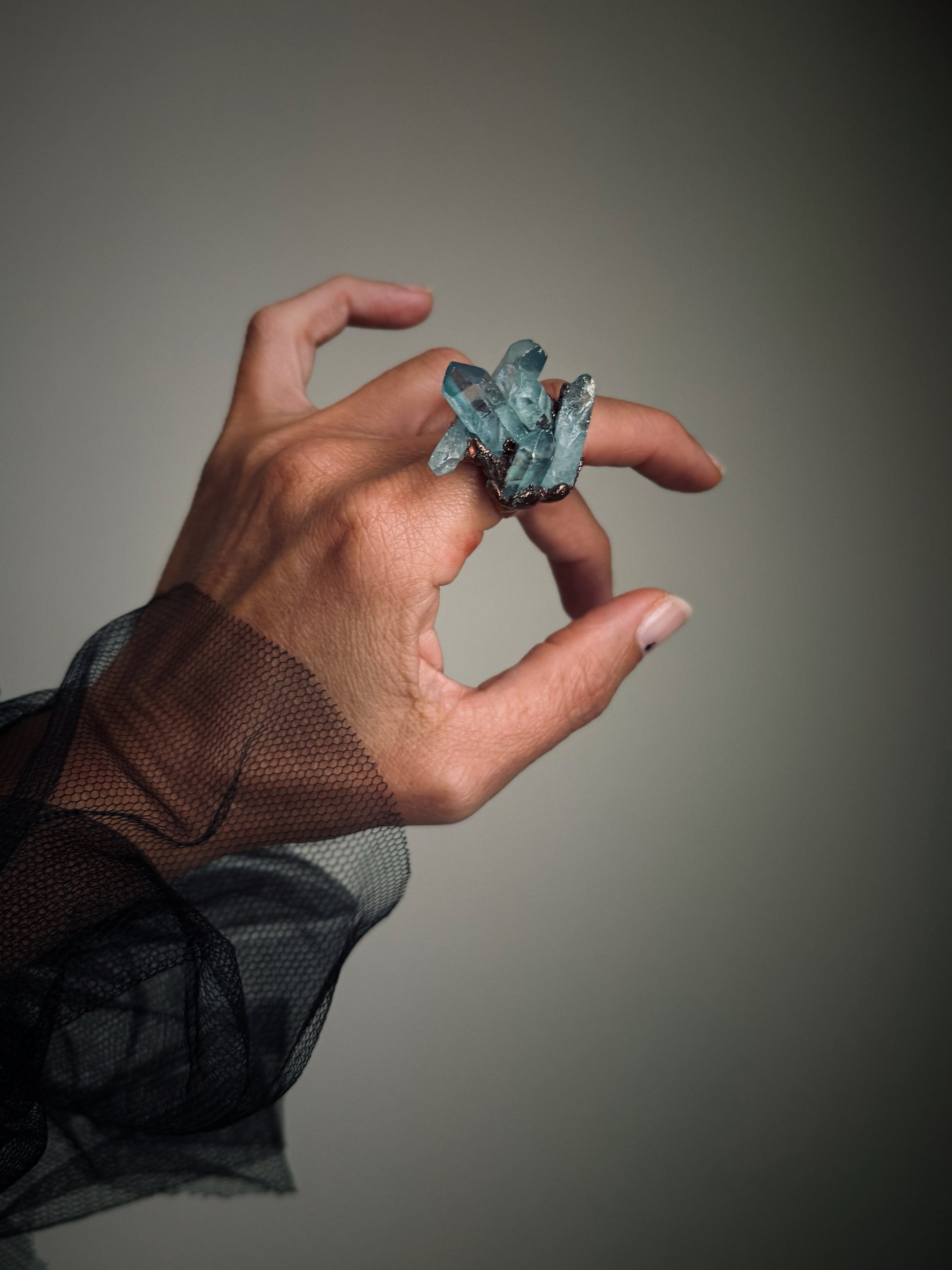 Le punte di quarzo aura sono cristalli naturali di quarzo trattati con vaporizzazione di metalli preziosi come oro, titanio o platino, che creano un’iridescenza cangiante con riflessi che spaziano dal blu all’oro, dal rosa all’argento. Ogni punta conserva la forma naturale del cristallo, rendendo l’anello luminoso e dinamico.