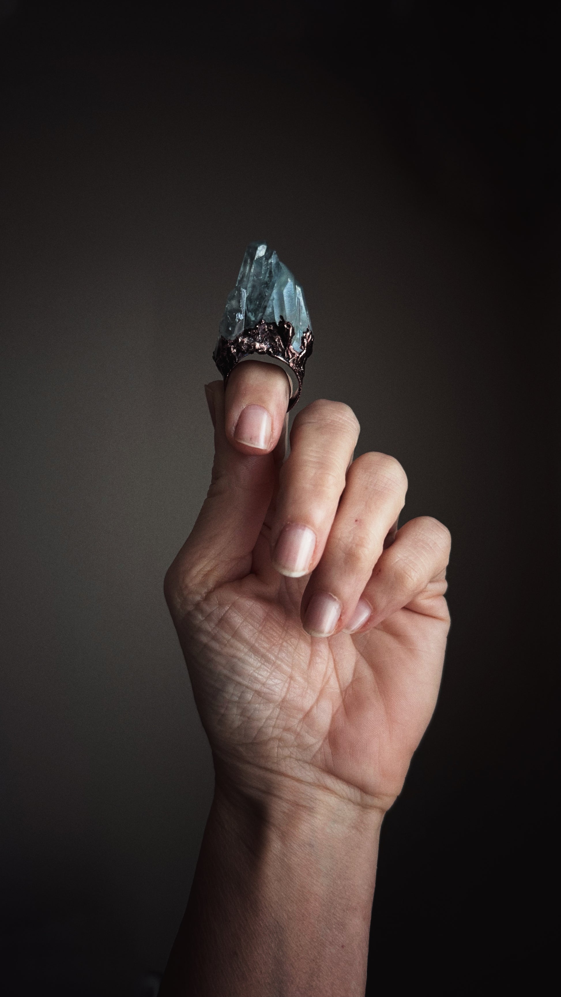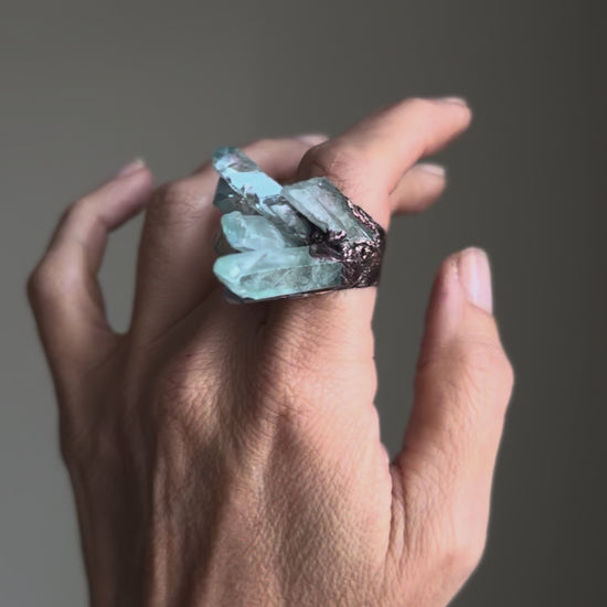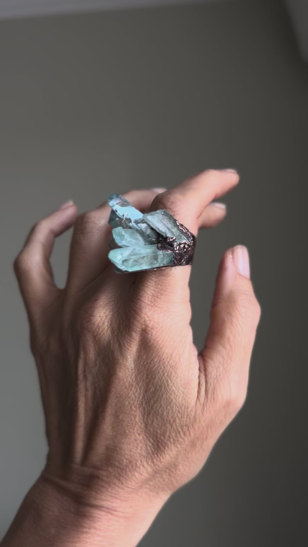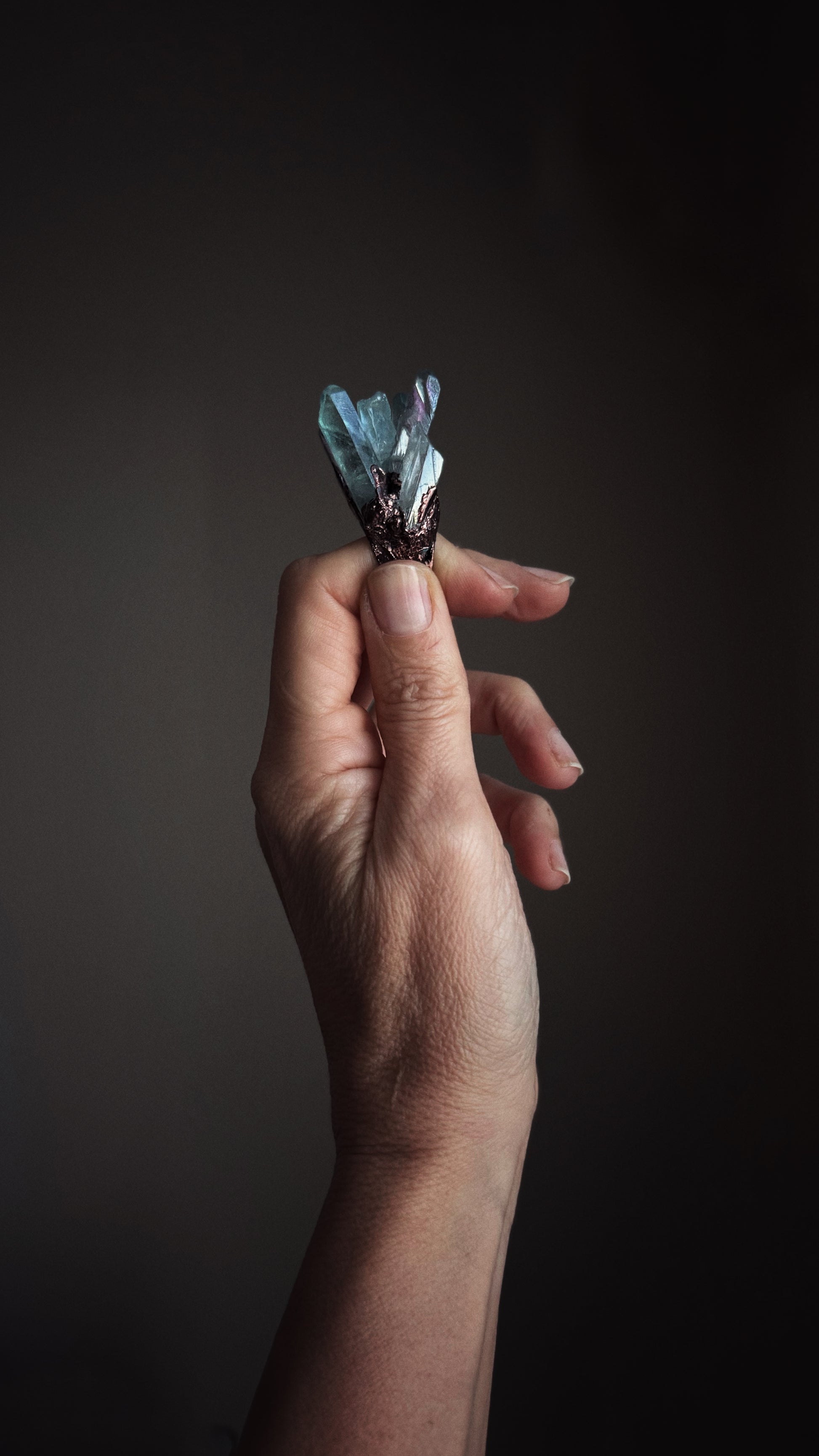 Anello in rame brunito con punte grezze di quarzo aura - Un gioiello statement che cattura la luce con riflessi iridescenti cangianti.