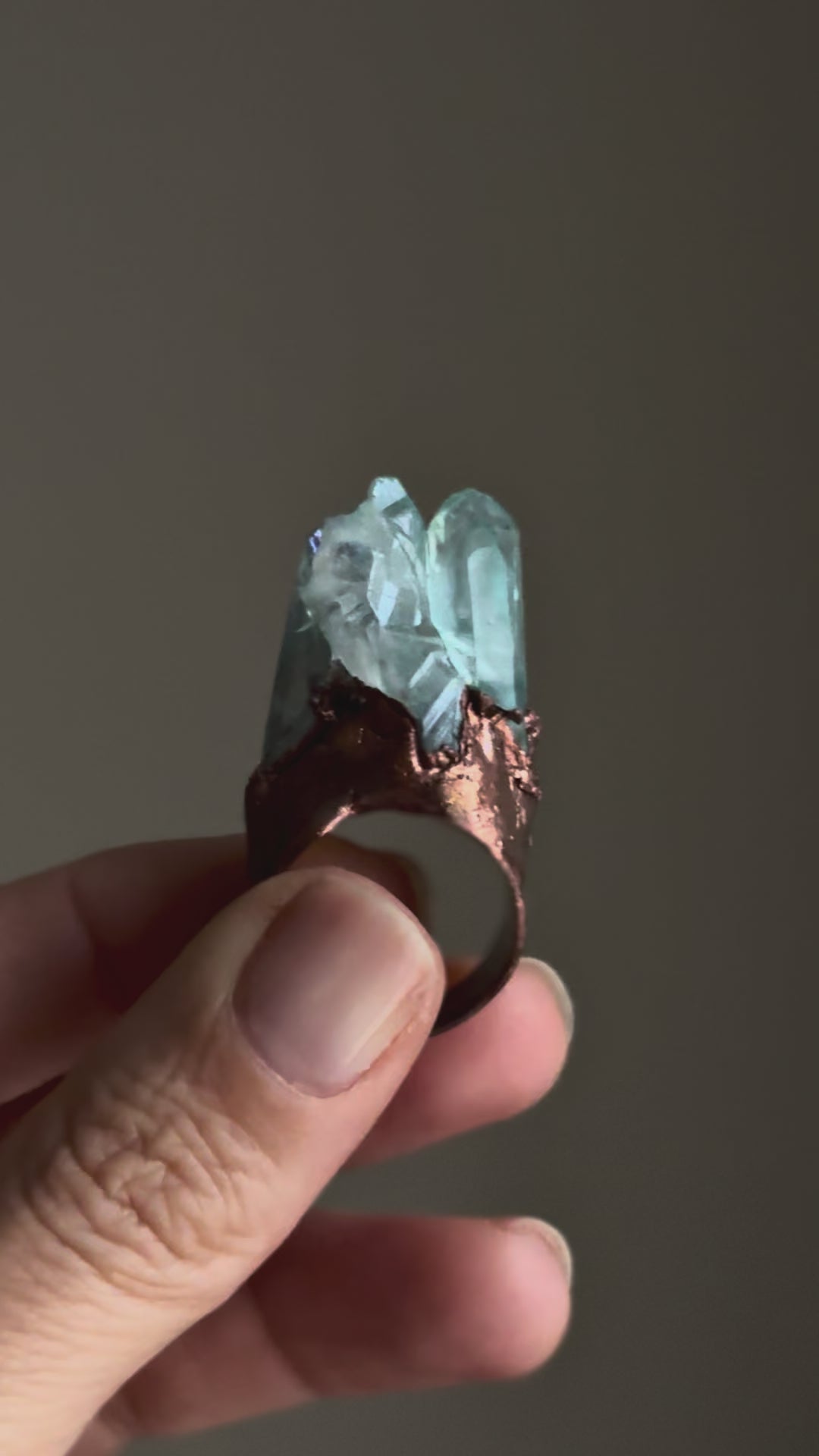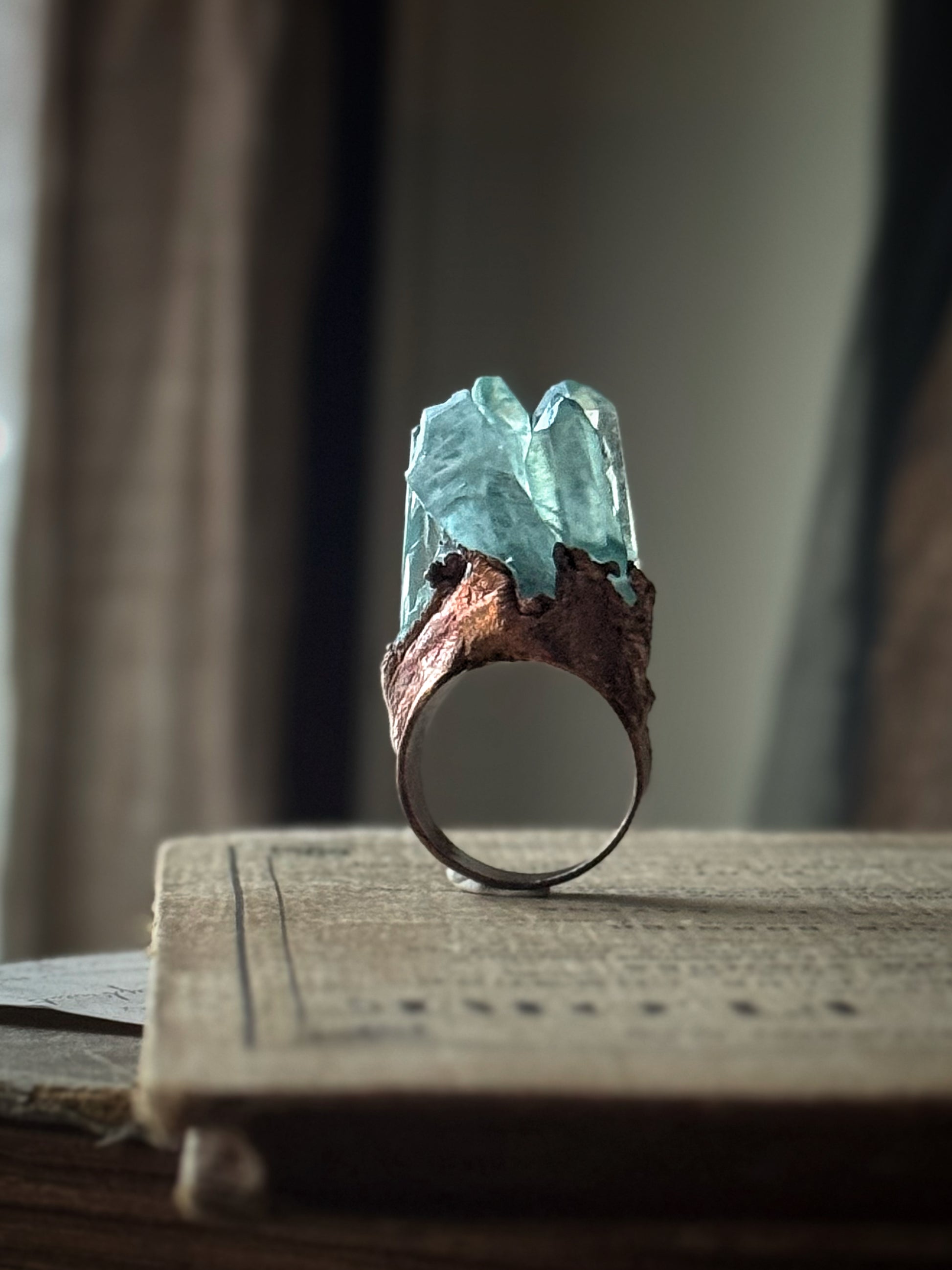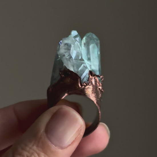 Anello in rame con punte grezze di quarzo aura