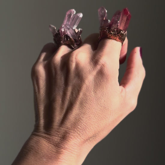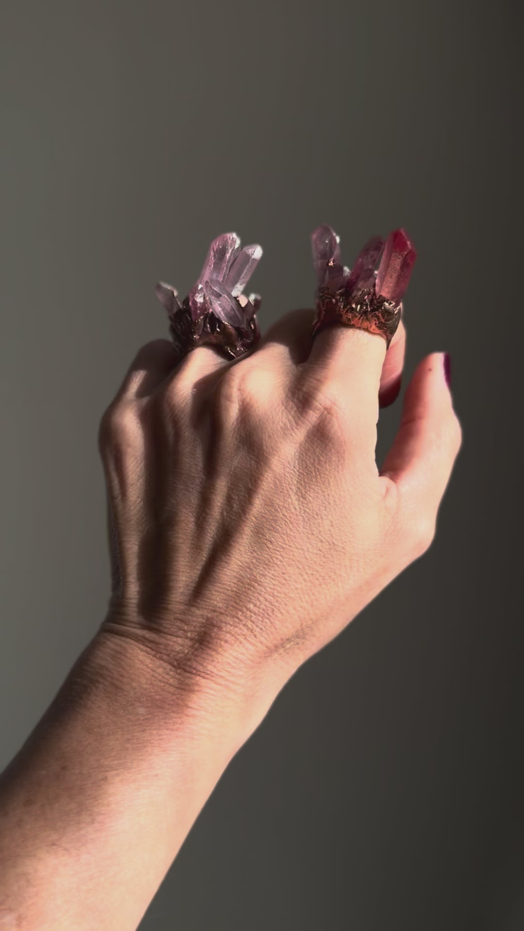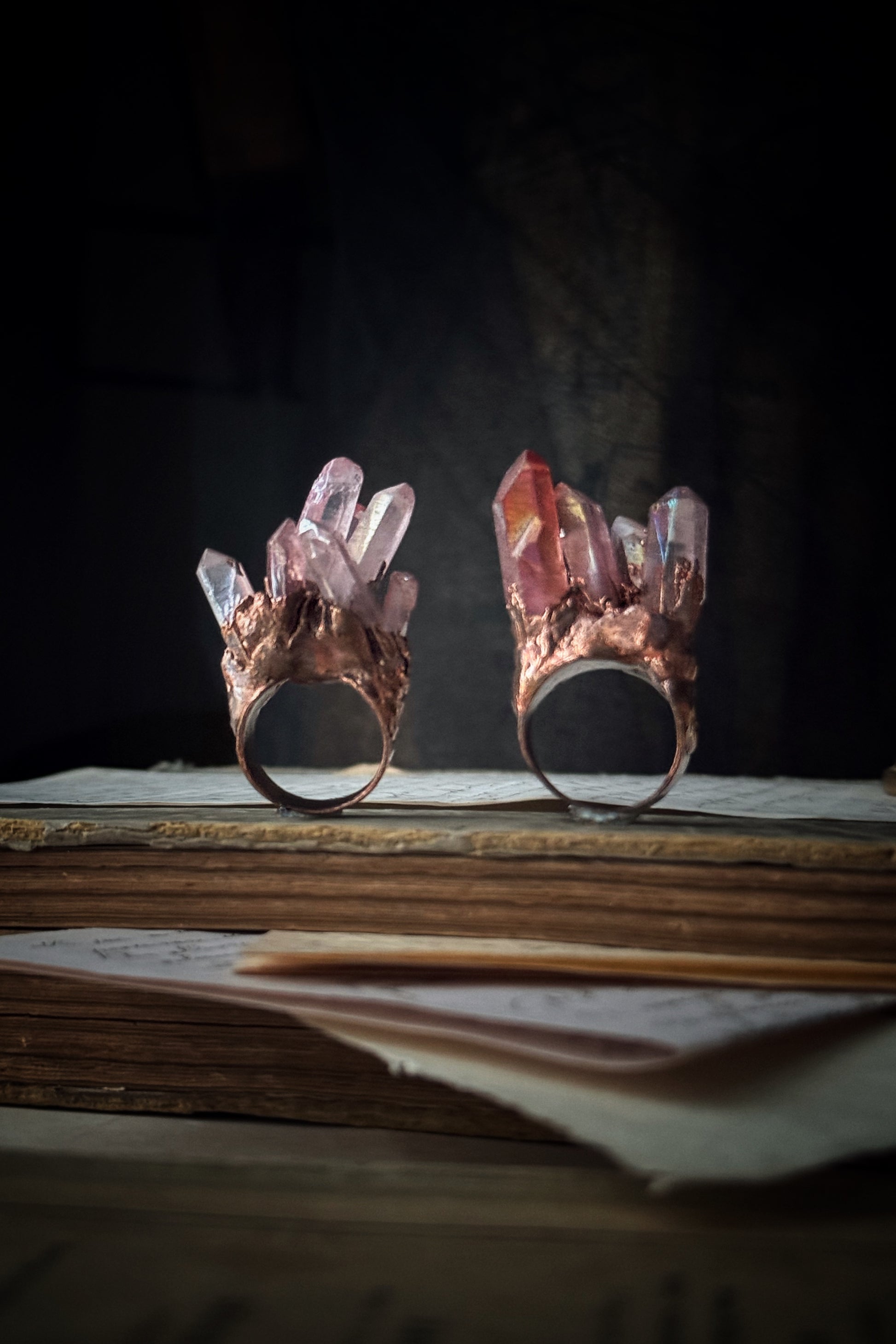 Un pezzo dal forte impatto scultoreo, montato su una fascia larga in rame lavorata per garantire stabilità e presenza al dito. Su questa base imponente, si innalzano sette punte di Quarzo Aura Rosa, disposte artisticamente come stalattiti in un paesaggio minerale. I cristalli naturali svettano con la loro forma appuntita, avvolti da un'iridescenza delicata che sfuma dal rosa pallido al color pesca, donando un tocco etereo e mistico alla robustezza del metallo.