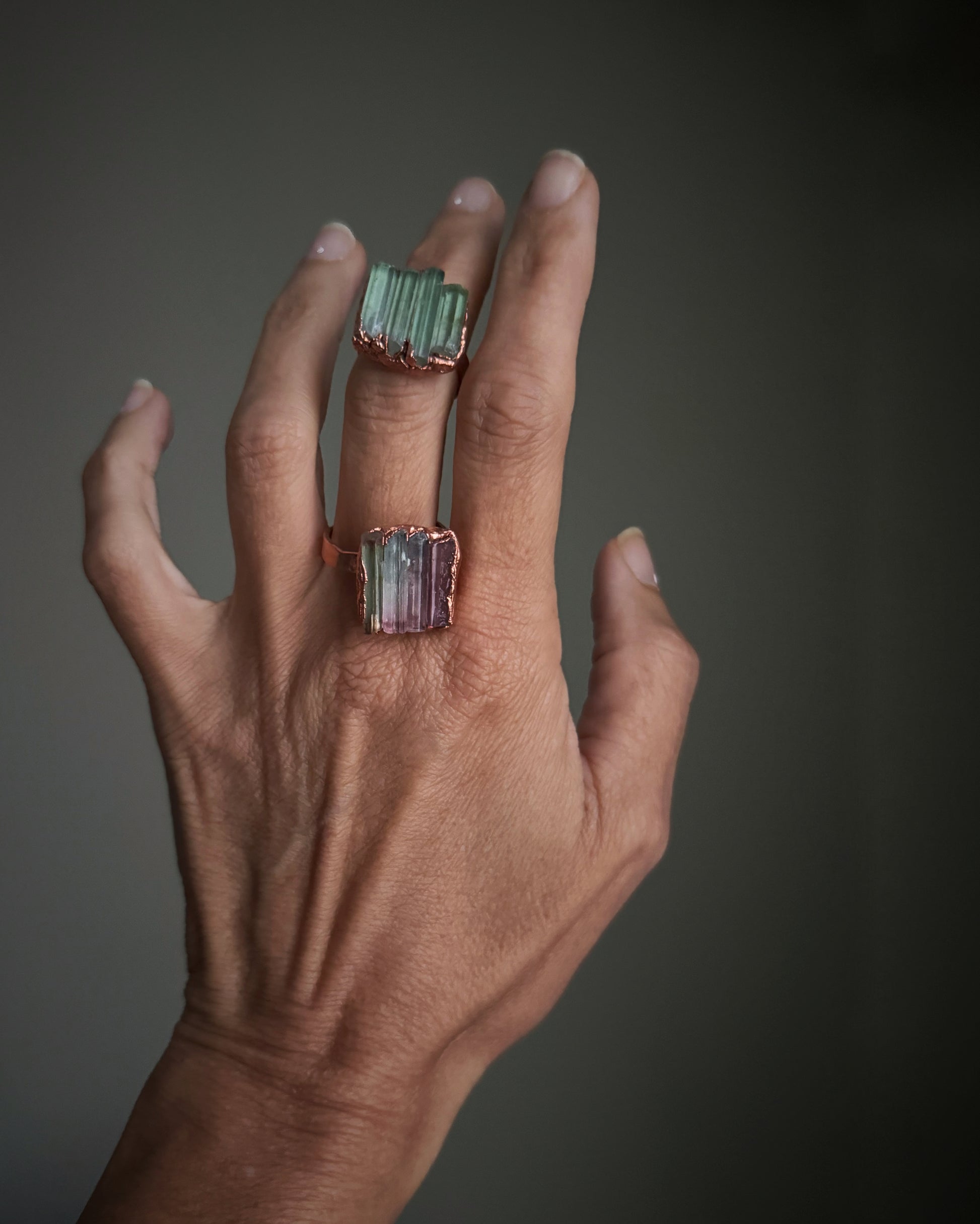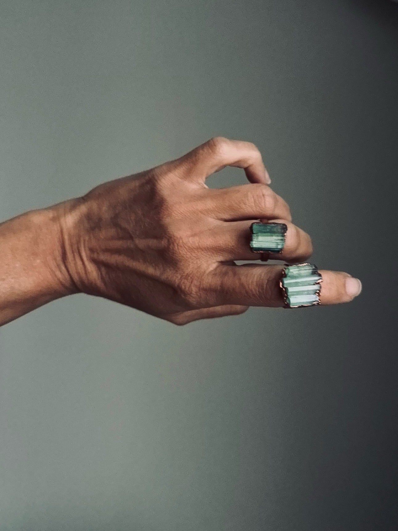 Questo anello è il risultato di una fusione tra l'energia primordiale della tormalina verde e l'arte paziente della lavorazione del rame. Ogni pezzo è realizzato a mano con pezzi di tormalina verde naturale grezza, la cui forma e colore unici rendono ogni anello una creazione singolare. L'incastonatura in rame, ottenuta tramite un processo artigianale, avvolge la pietra e ne esalta il contrasto cromatico.