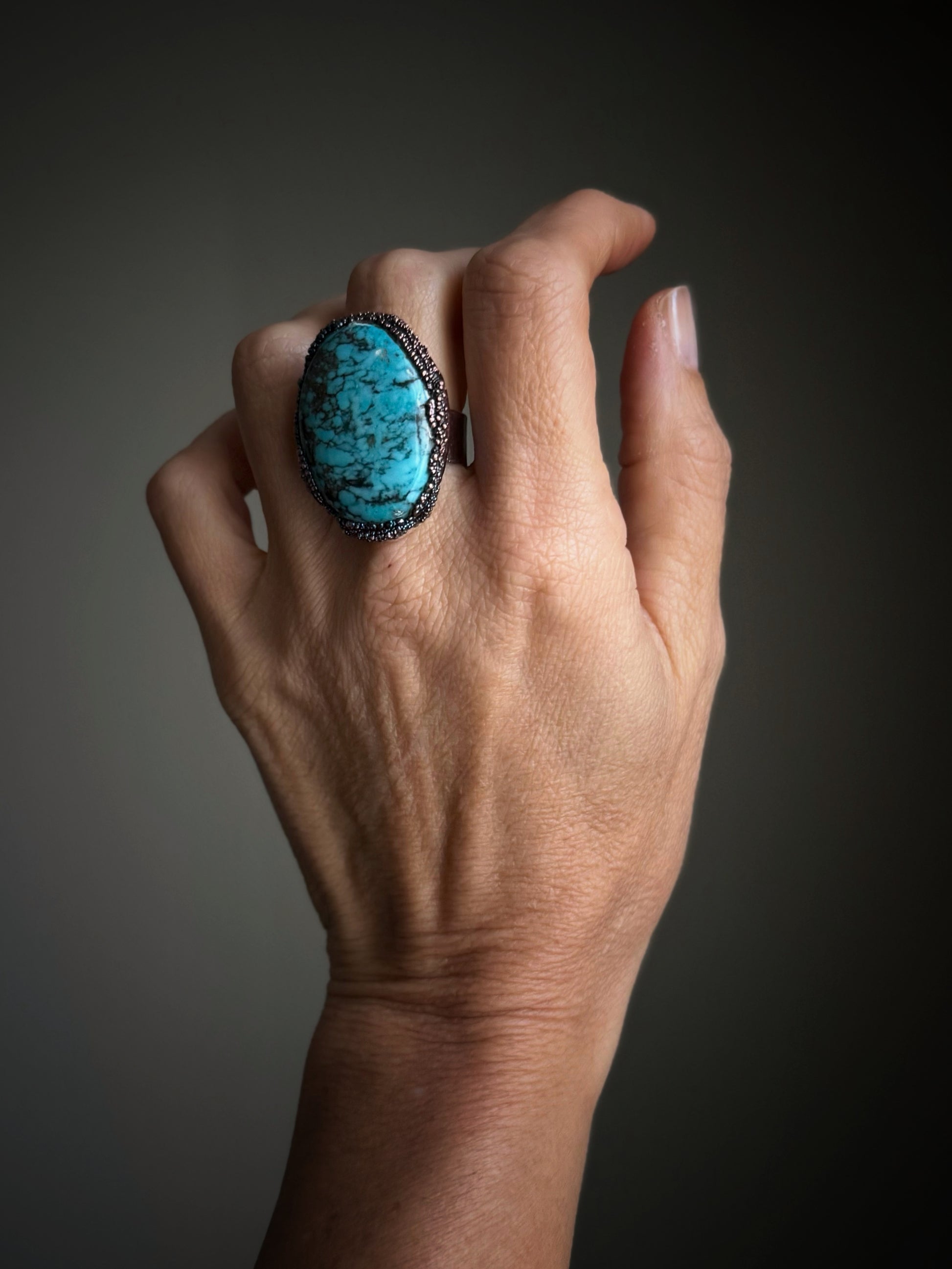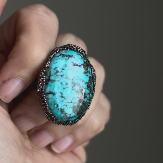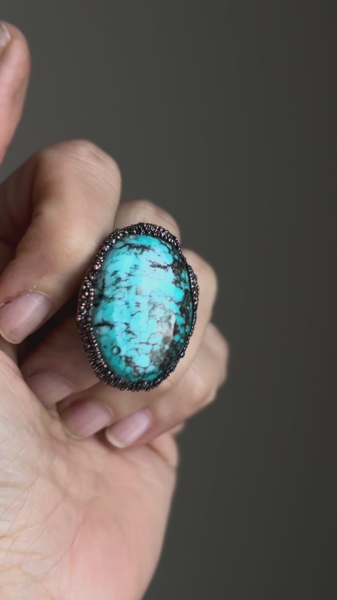 Anello artigianale in rame brunito con turchese Arizona naturale - Un gioiello che celebra la bellezza autentica del turchese americano con le sue imperfezioni uniche.