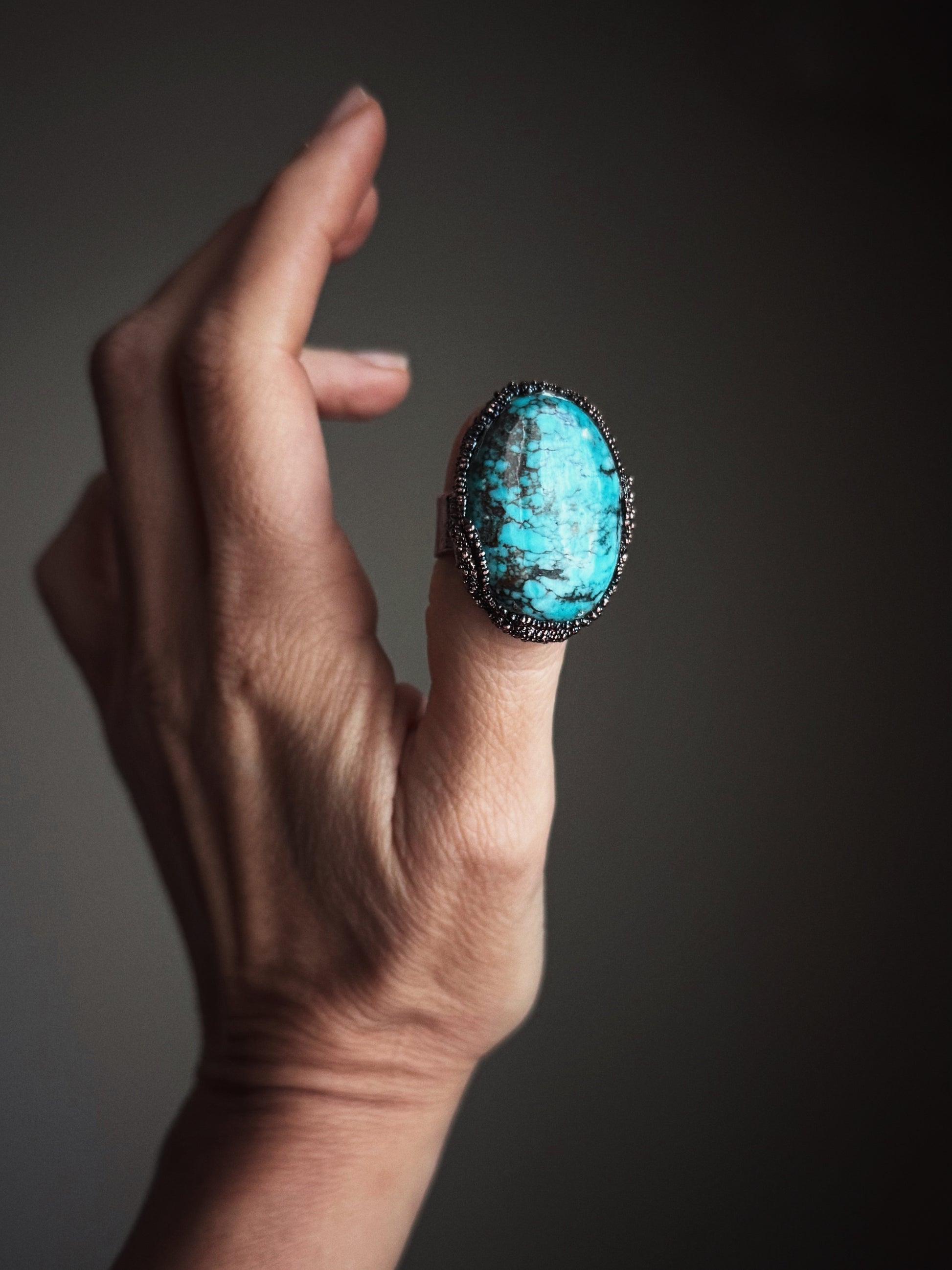 Stile e occasioni d'uso: Ideale per chi ama gioielli statement con carattere forte e autenticità. Perfetto per look bohemien, western-chic, festival o come pezzo d'autore da collezione. Il turchese Arizona è apprezzato per il suo blu intenso e le venature naturali che raccontano la storia geologica della pietra.