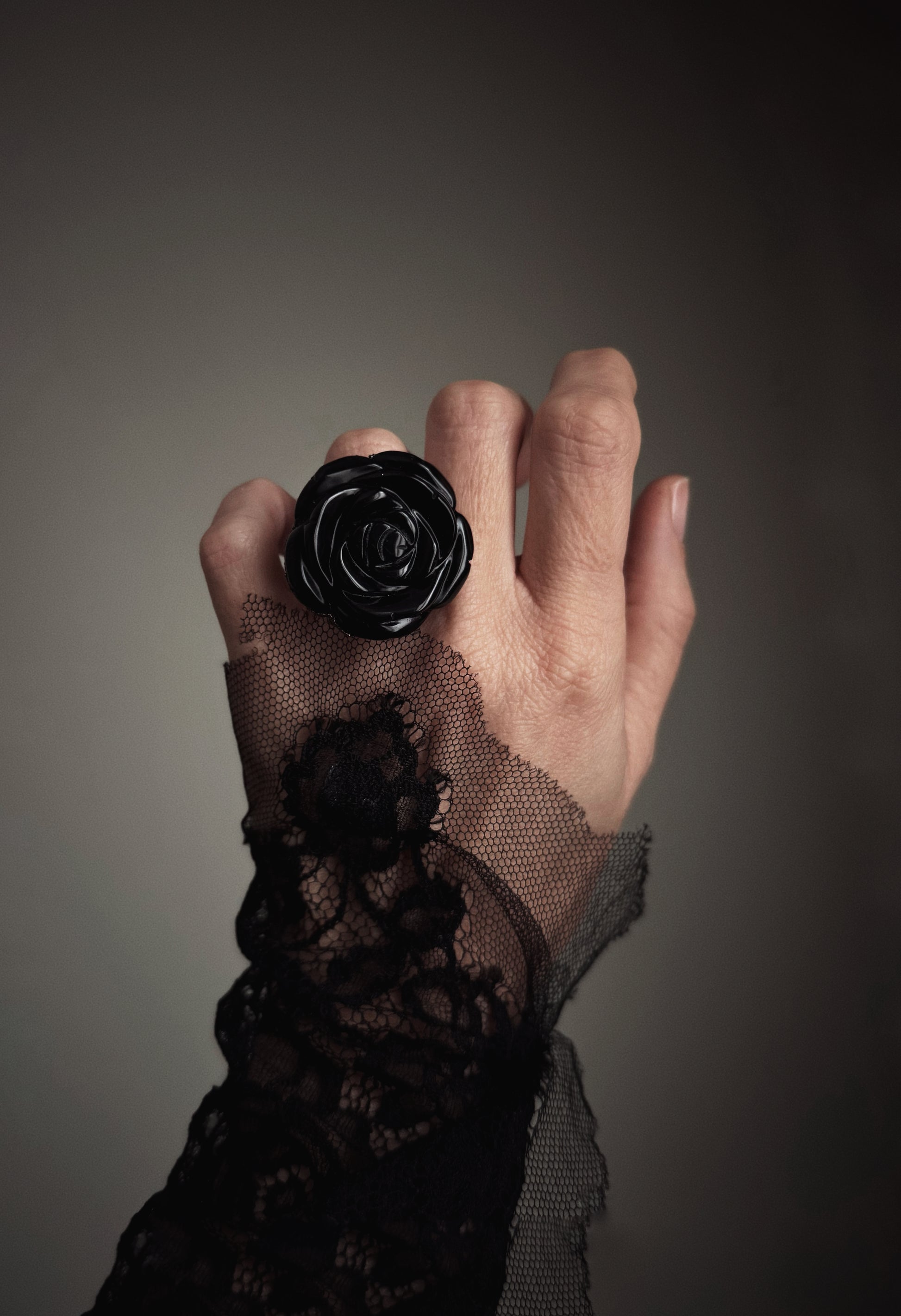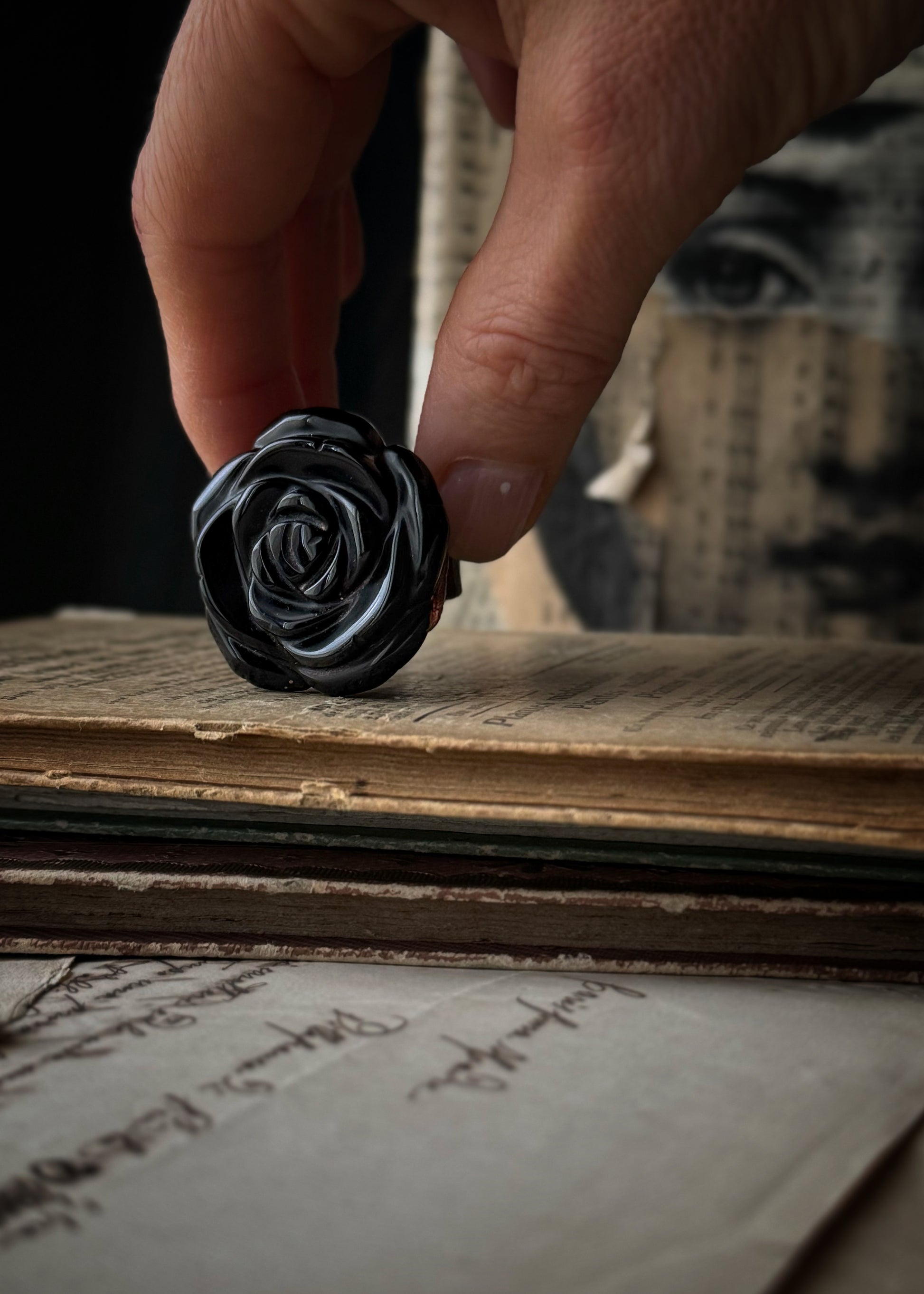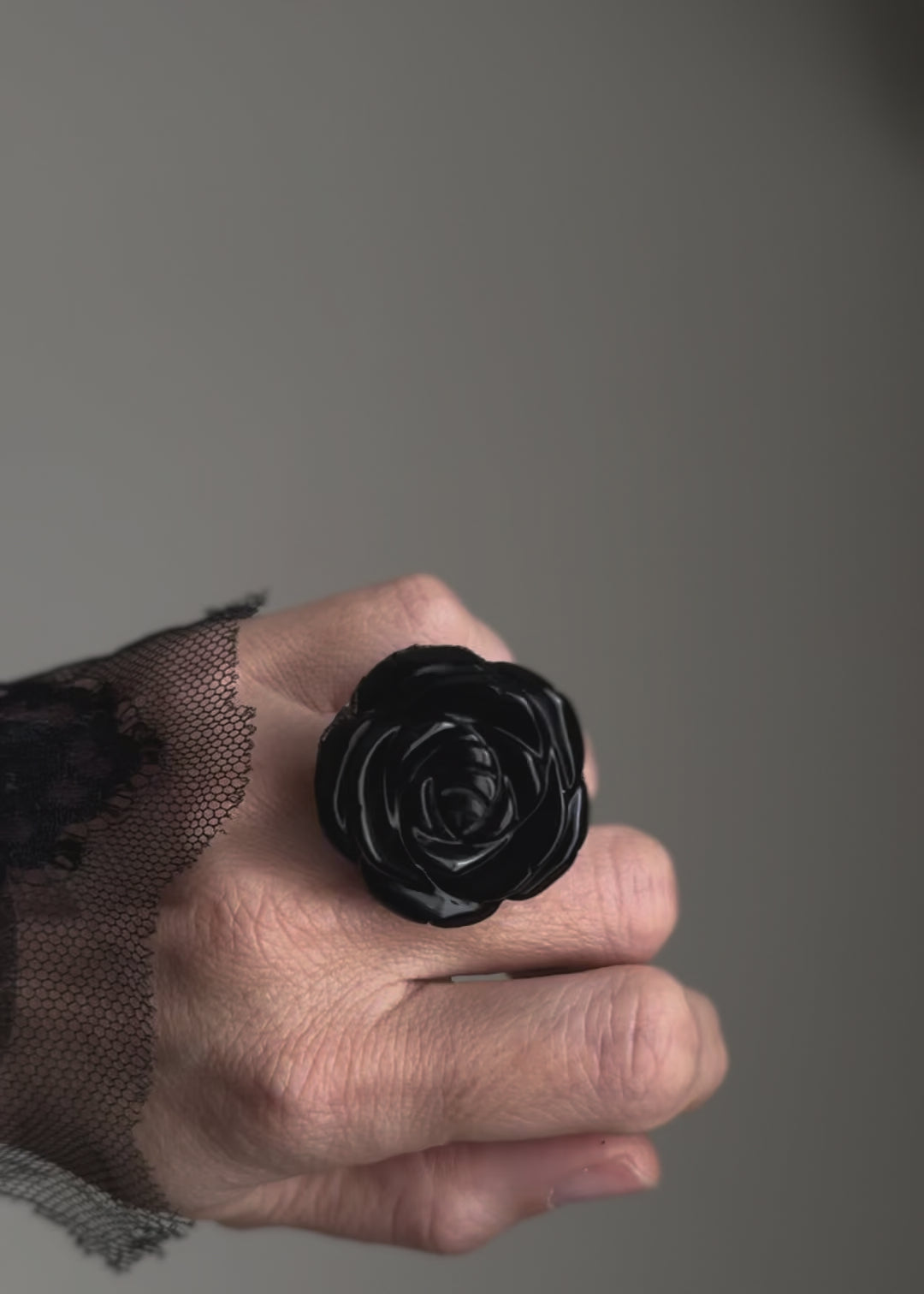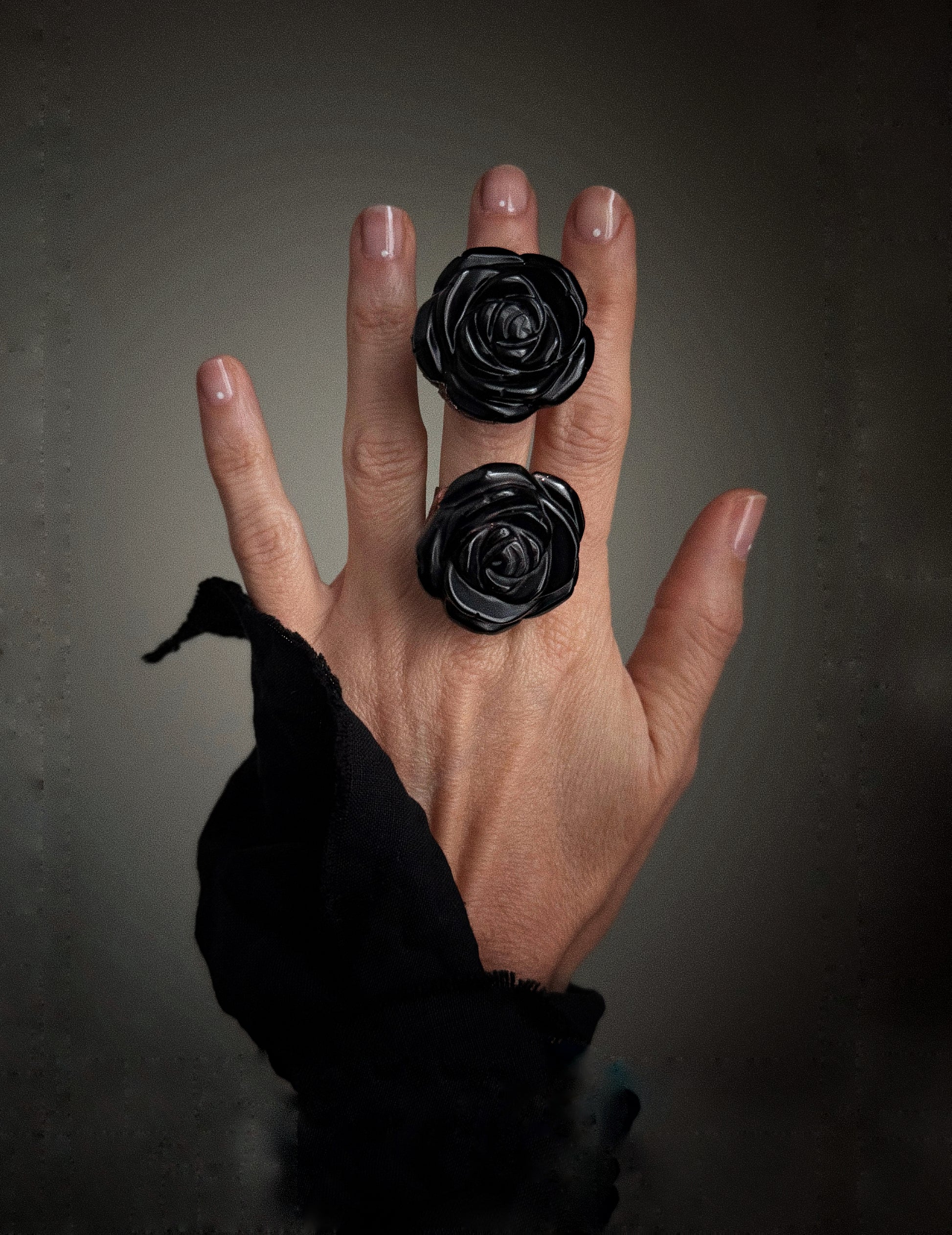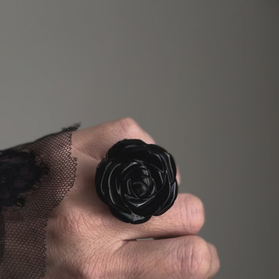 Questo anello è costruito attorno a una rosa scolpita in ossidiana naturale, una pietra nera compatta, lucida, di origine vulcanica. La scultura ha una presenza netta e decisa: i petali emergono uno sull’altro con un ritmo pieno, senza leggerezza decorativa.
