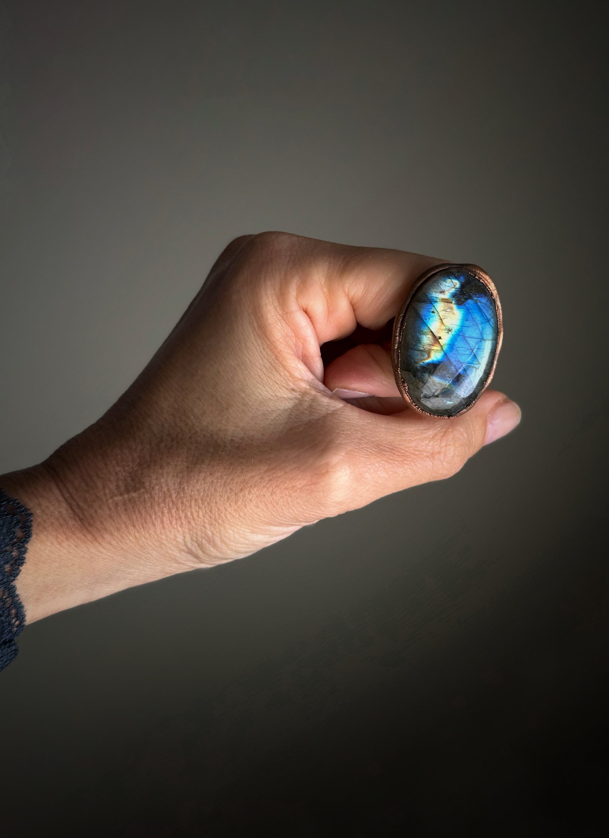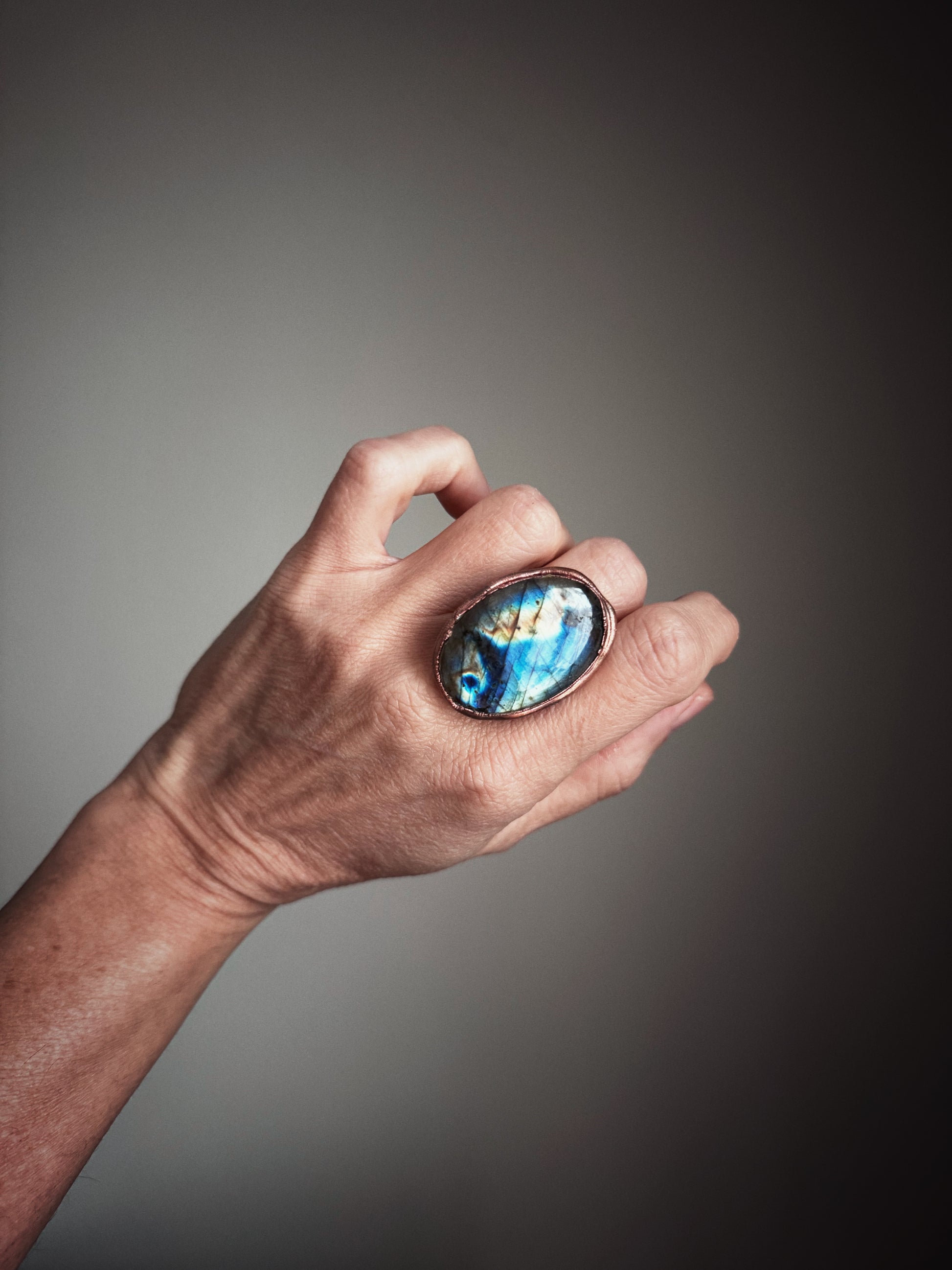 Anello artigianale con labradorite blu ovale – un gioiello magico che cattura la luce con riflessi iridescenti unici.