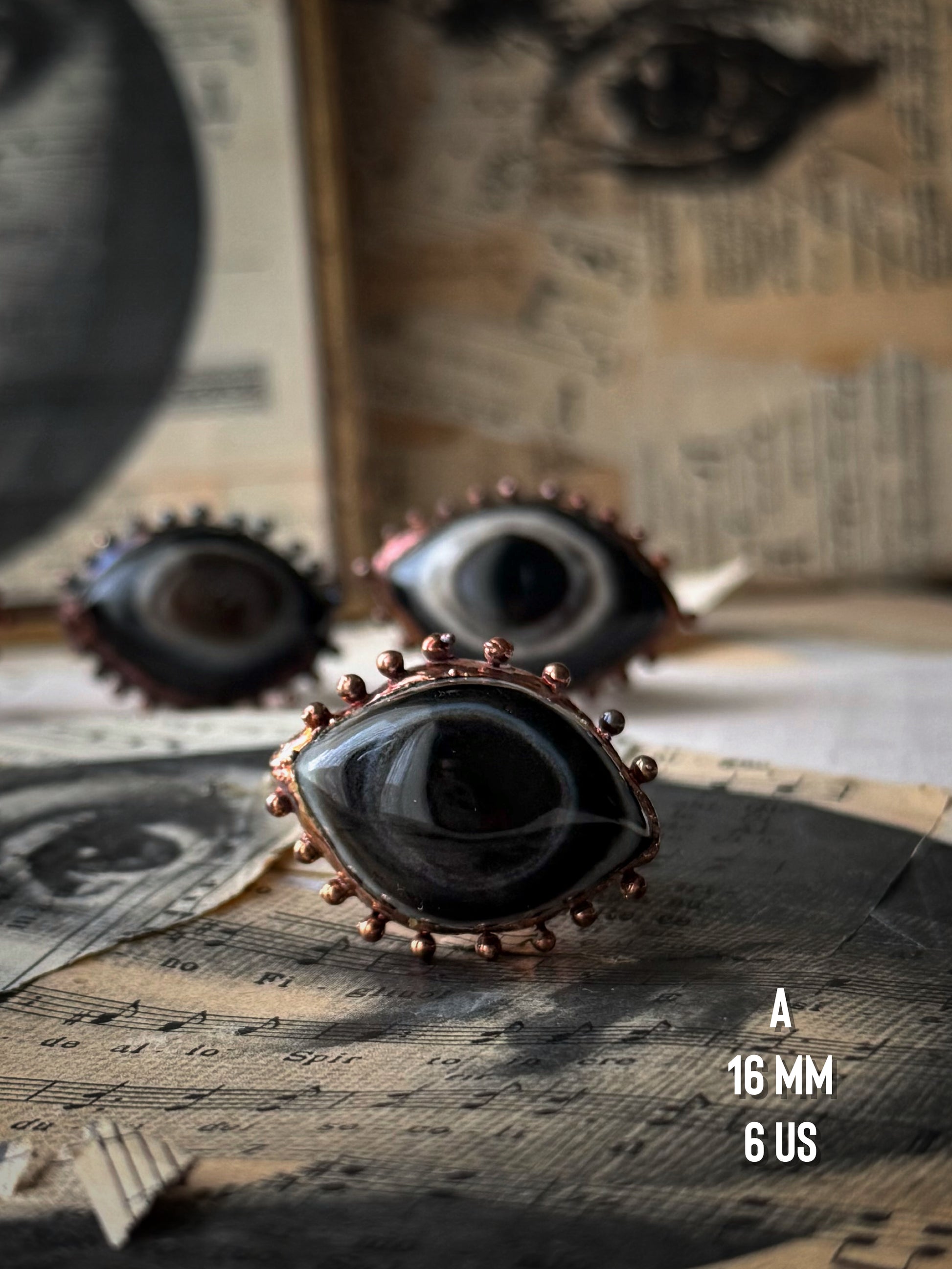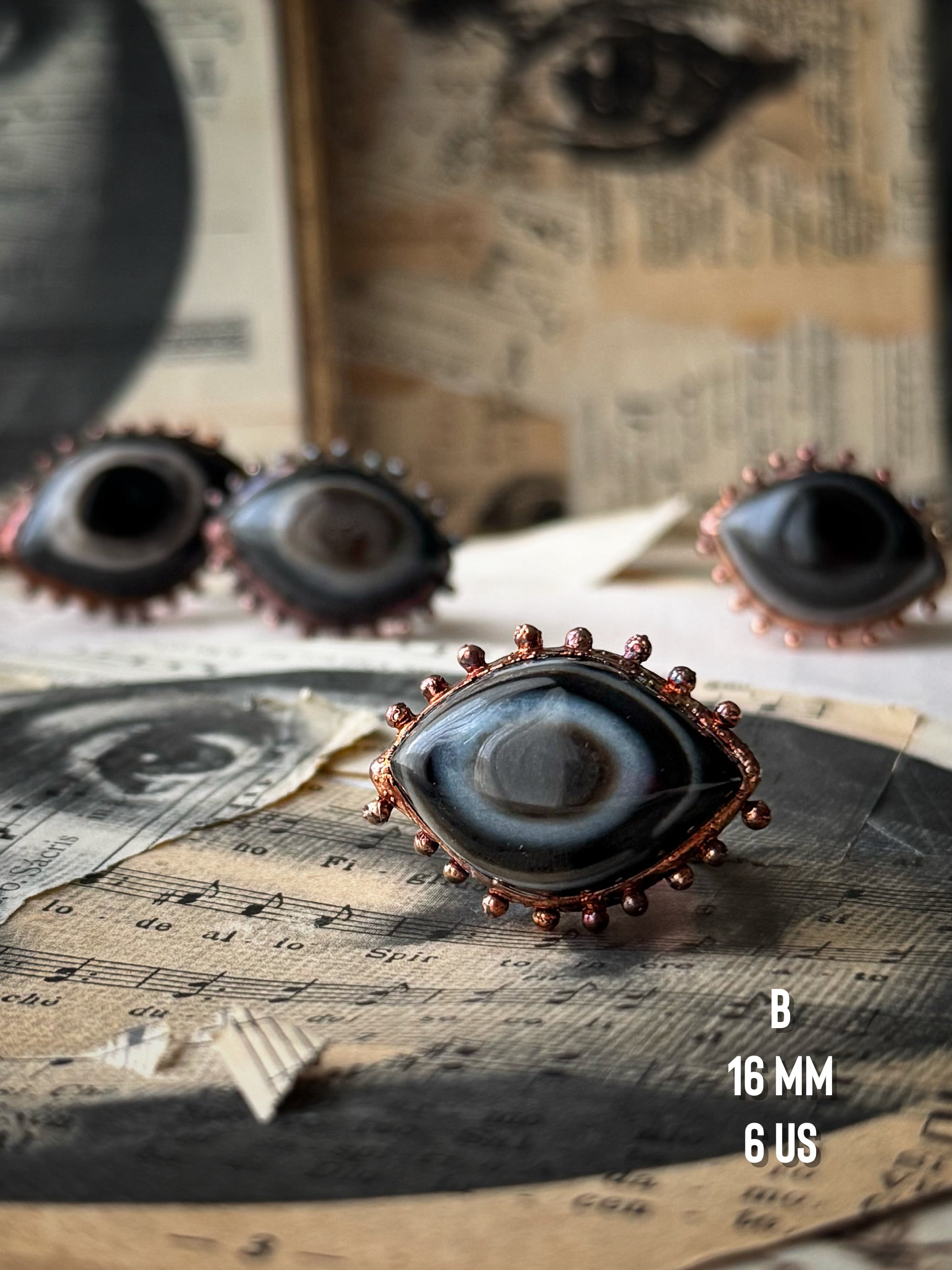 Proprio perché si tratta di pattern naturali, non esistono iridi perfette, pupille simmetriche o forme identiche: ogni pietra mostra il proprio disegno unico e irripetibile. Questa particolarità è ciò che rende ogni anello autentico e diverso da qualsiasi altro.