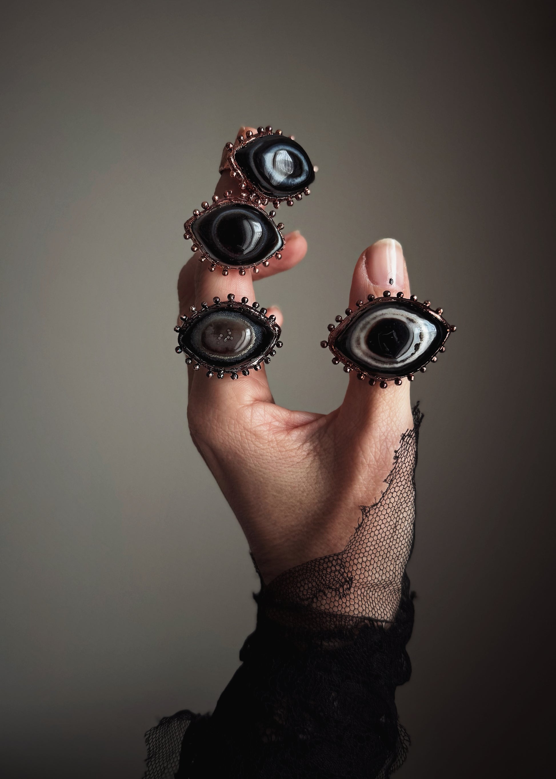 Quattro anelli scultorei realizzati a mano con agate naturali selezionate, ciascuna con disegni concentrici spontanei che ricordano un occhio aperto. Le venature sono formate dalla crescita minerale della pietra, quindi ogni esemplare è irripetibile.