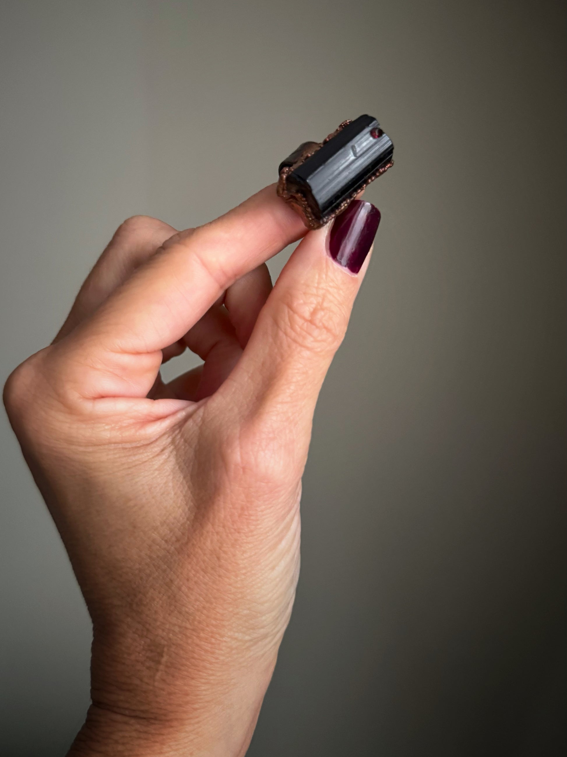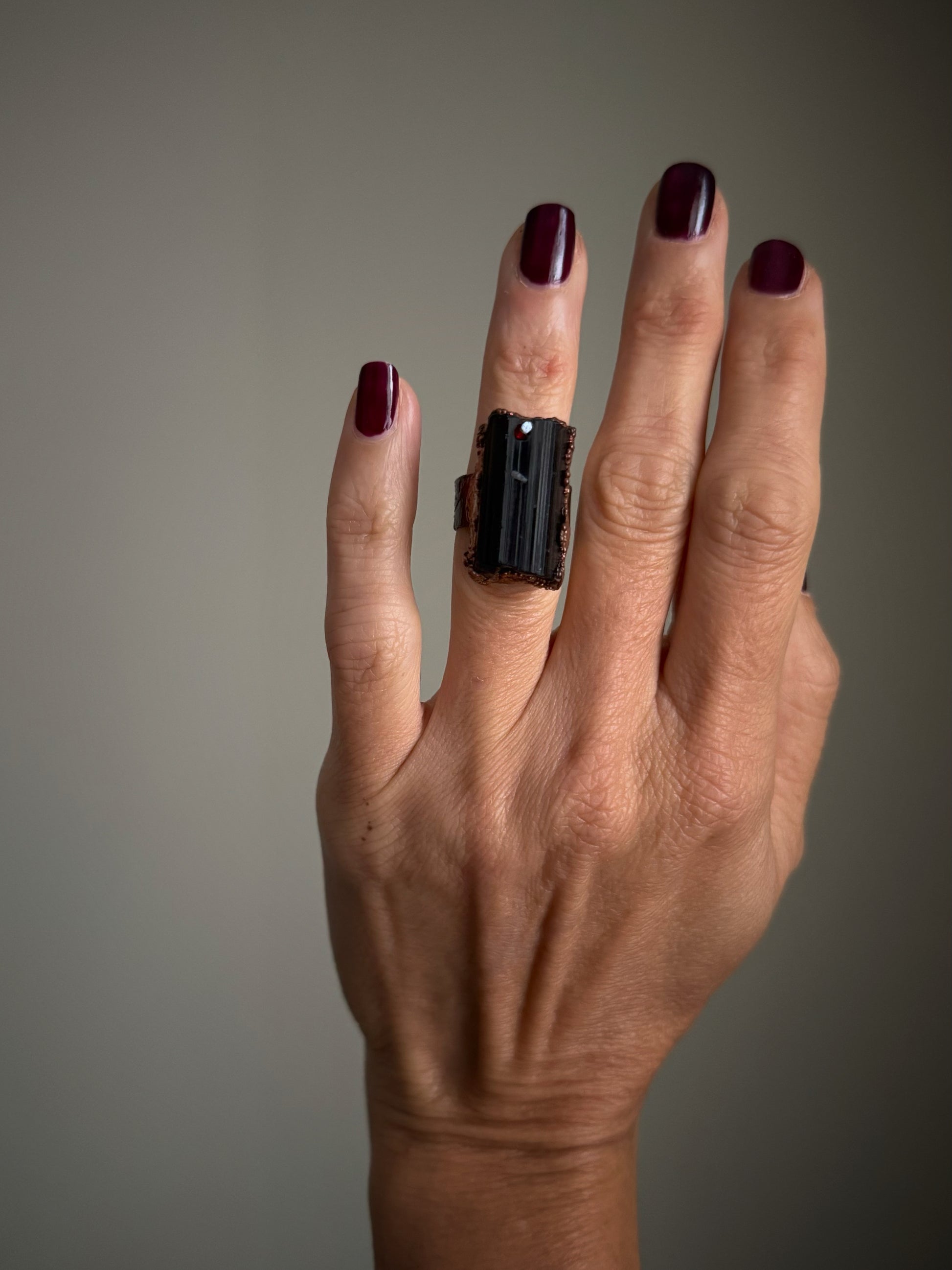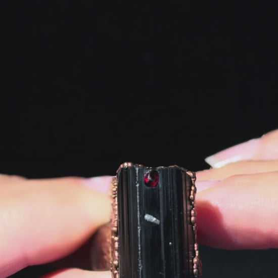 Anello in rame con Tormalina nera, granato e quarzo