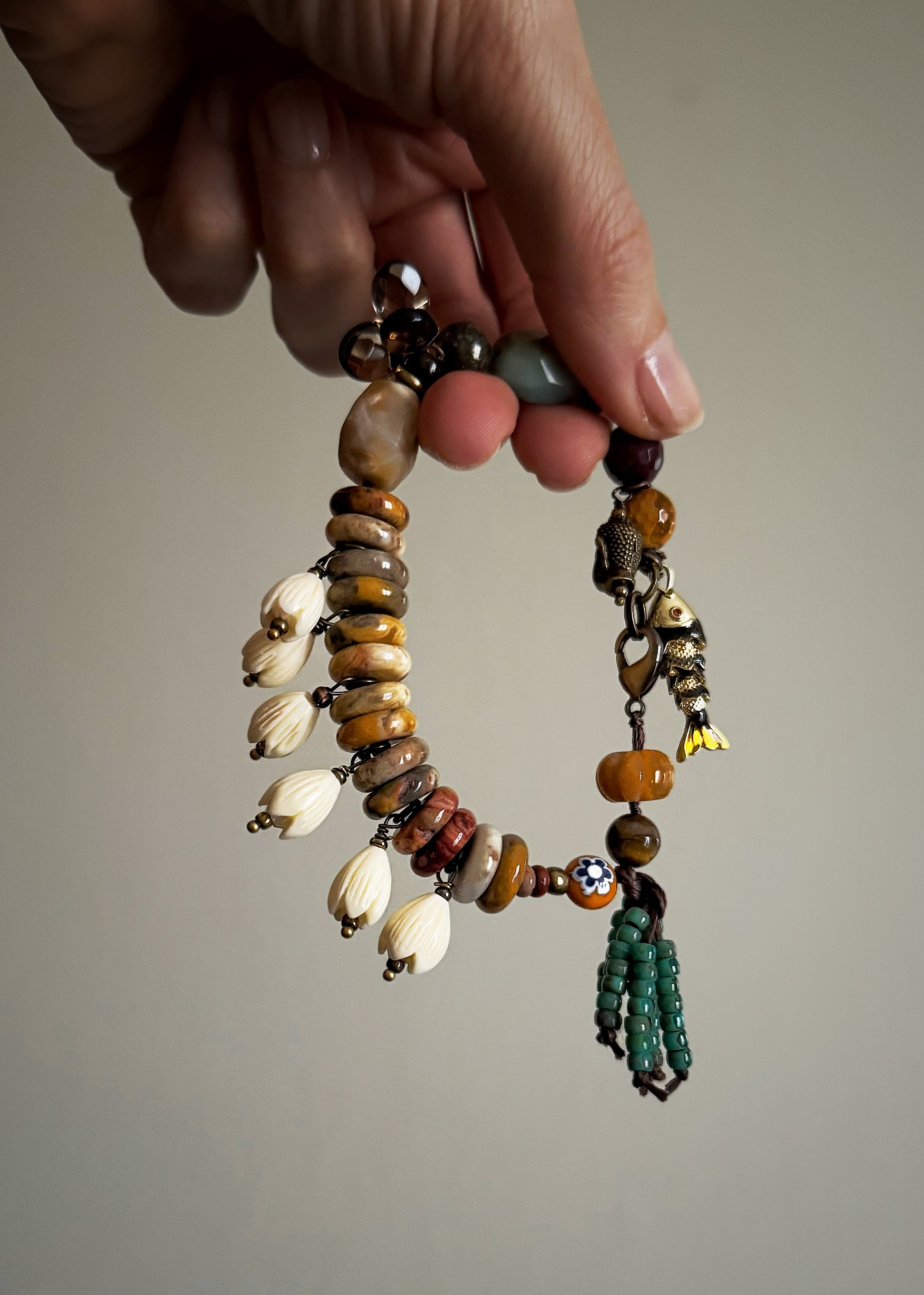 - Ciondoli: nappina di perline Toho , pesce snodato, grappolo di gocce in quarzo fumé, testa di Budda, fiori in turchese bianco sintetico.