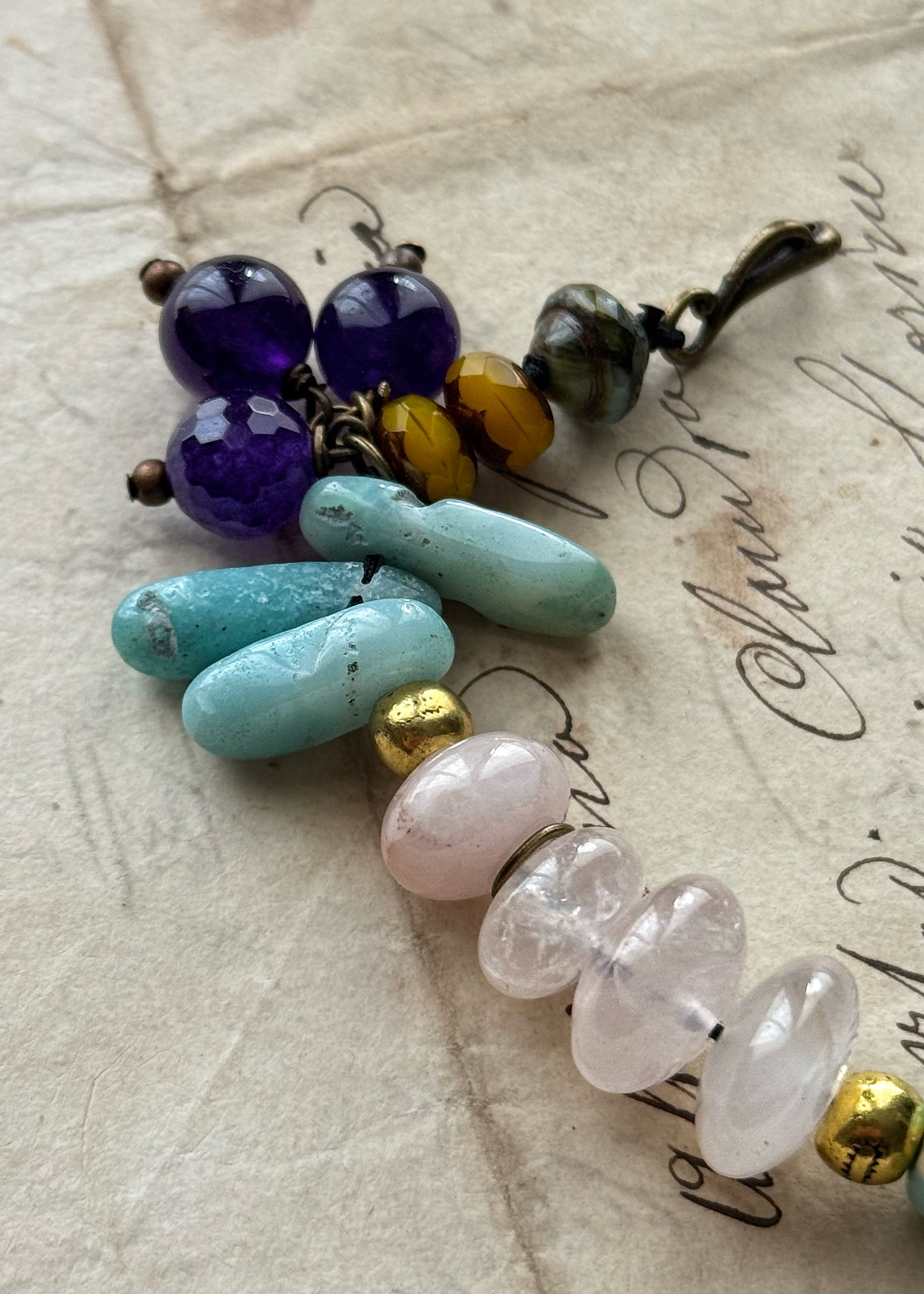 - Materiali naturali di alta qualità: Quarzo rosa, regalite, amazzonite, citrino, ametista, vetro africano, ed elementi in stile tibetano.
