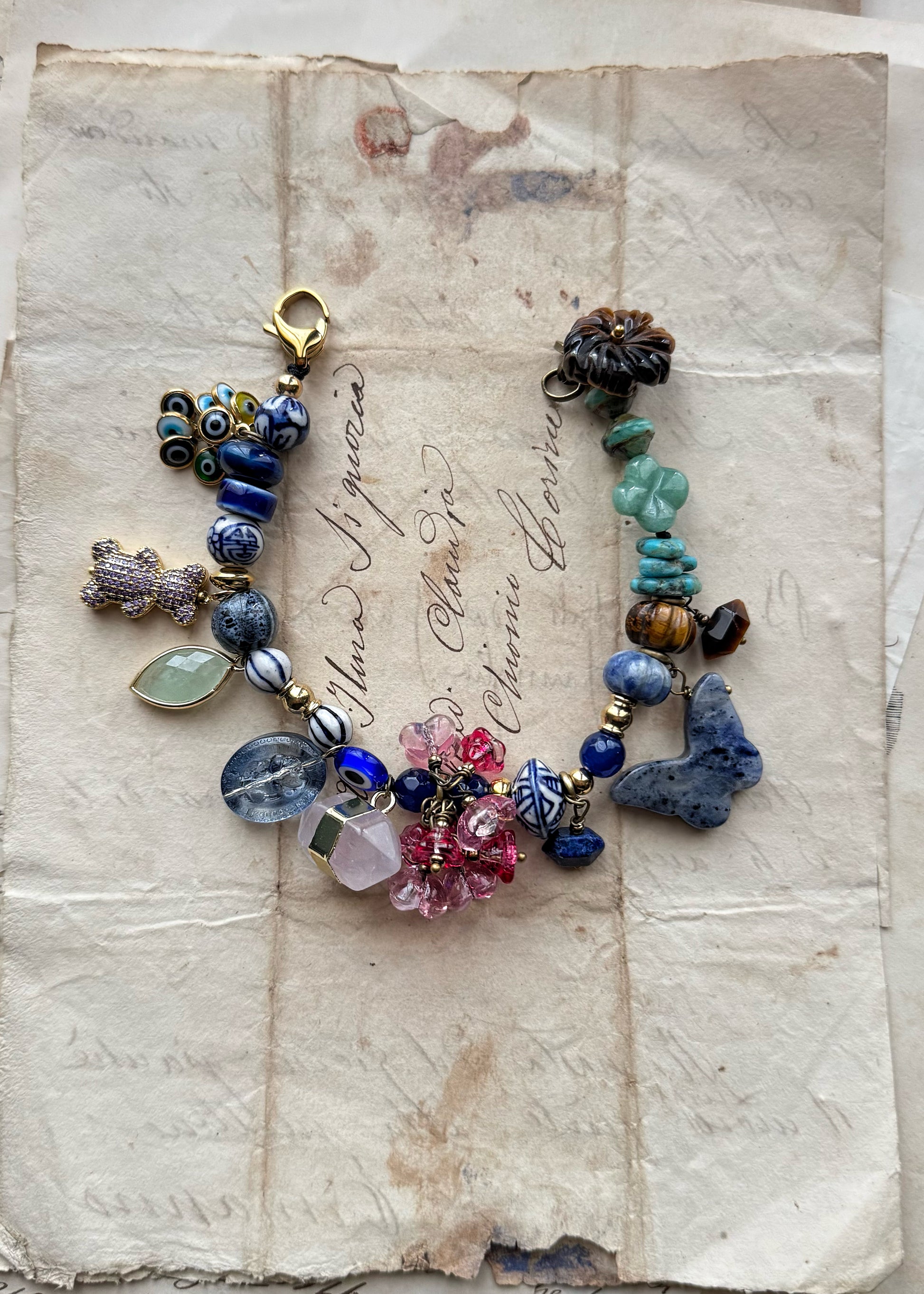 - Ciondoli: grappolo di fiori in vetro, farfalla e punta di lapislazzuli, punta di quarzo, goccia di fluorite verde, orsetto strass, grappolo Nazar boncuk (perla contro lo sguardo)