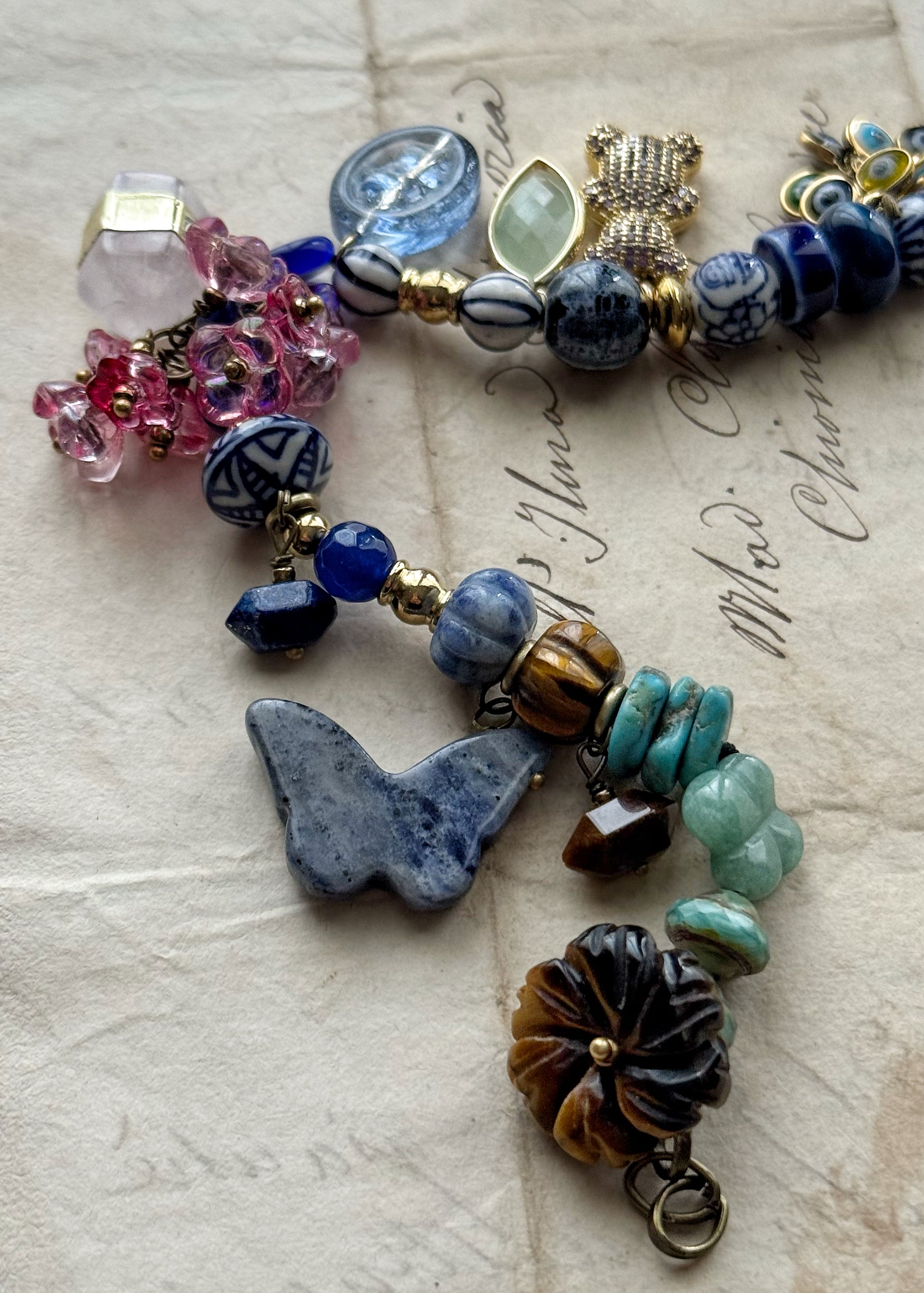 Bracciale realizzato a mano con pietre naturali, ceramiche dipinte, strass, metalli pregiati, un gioiello unico che unisce eleganza e autenticità.