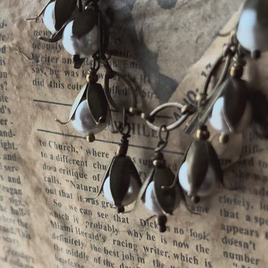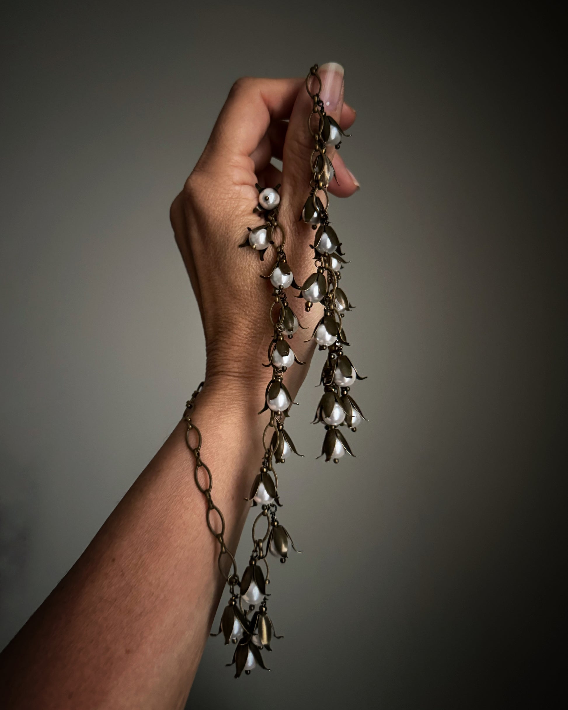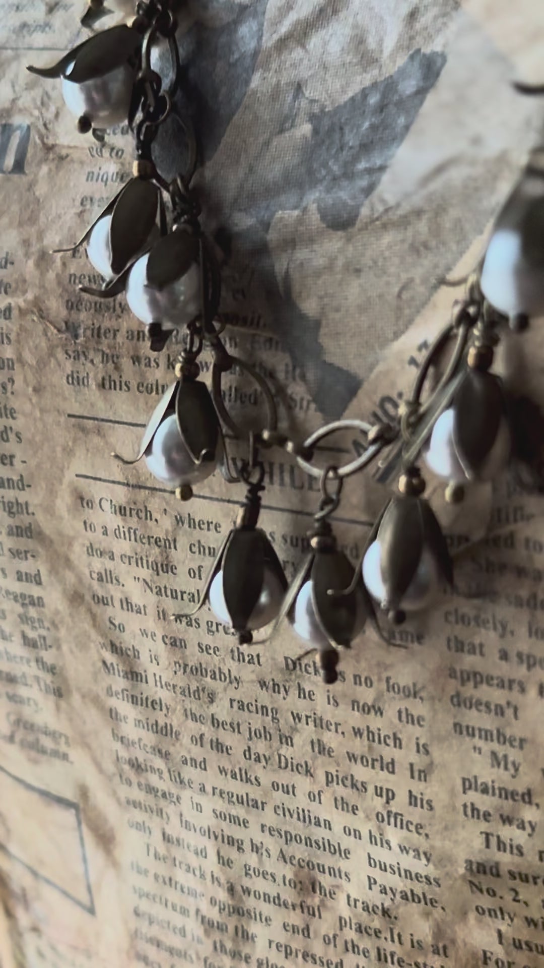 Realizzata a mano, questa collana è composta da 28 piccole perle montate come boccioli, fissate a una catena dal tono antico e caldo.