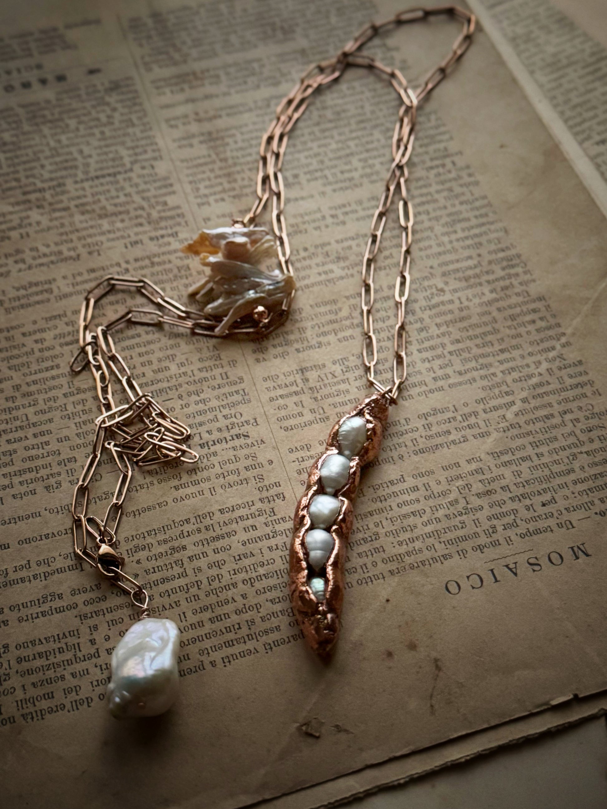 Ciondolo in rame con cinque perle d'acqua dolce incastonate