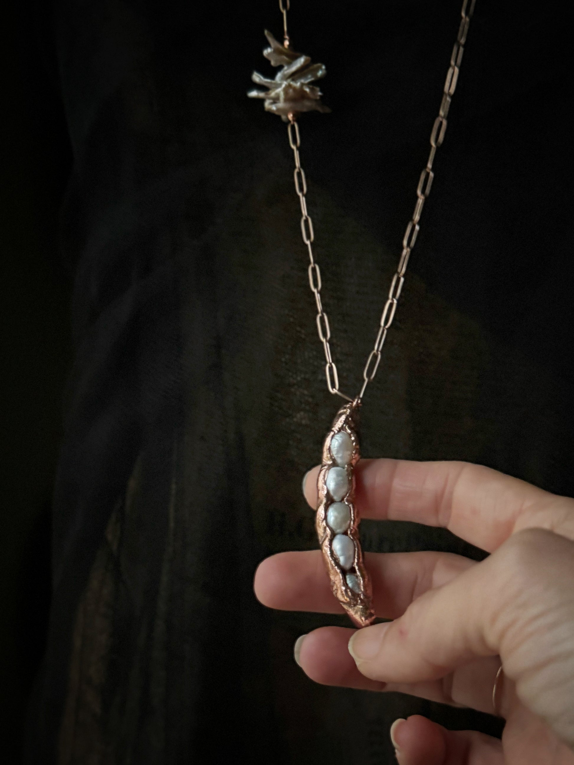 Ciondolo in rame con cinque perle in un baccello