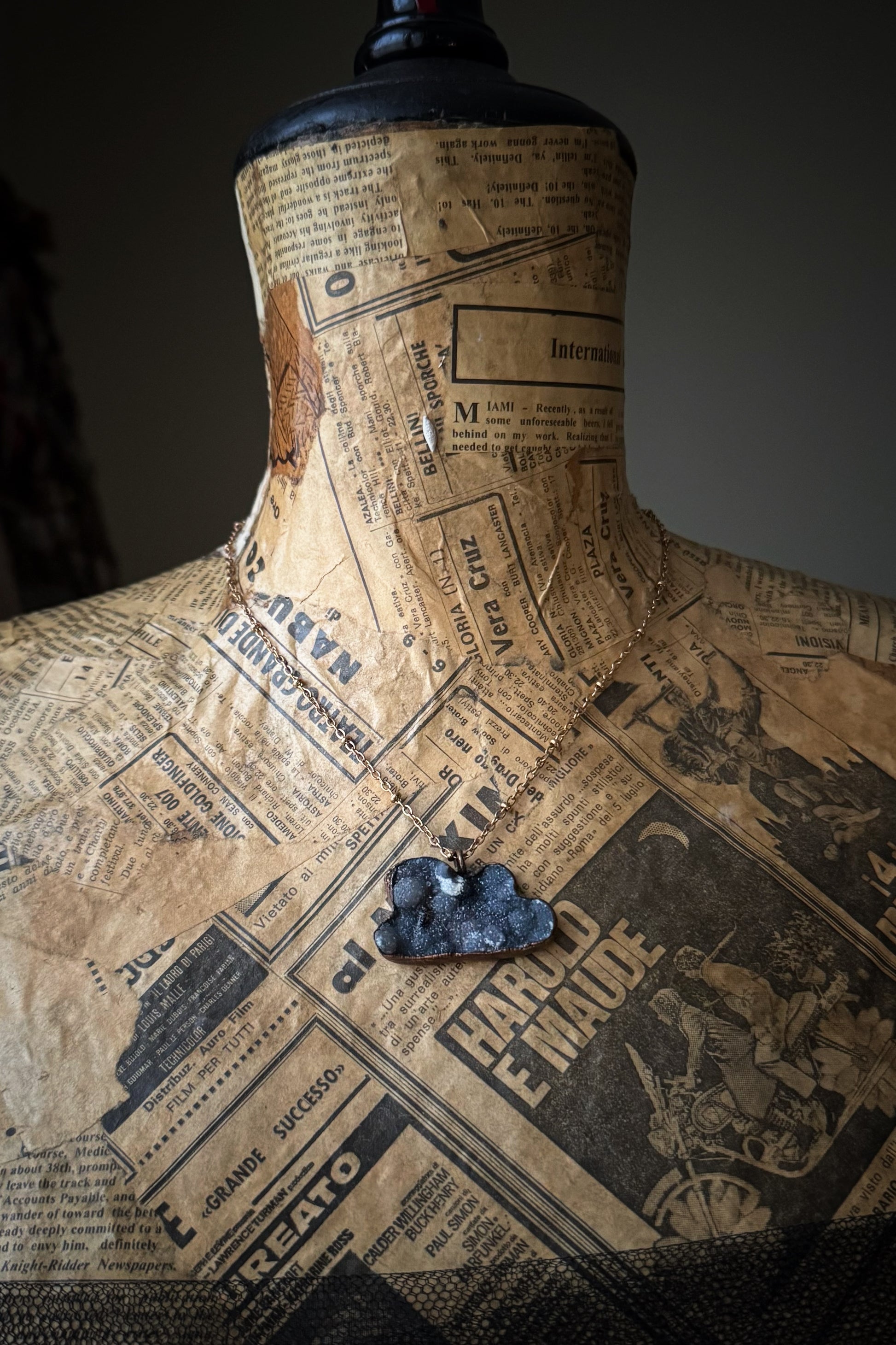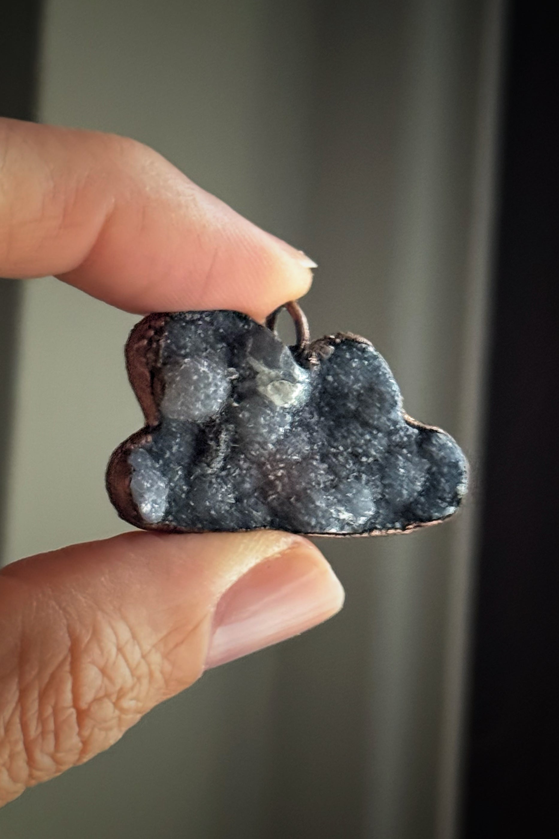 Questa drusa di quarzo, scolpita a mano a forma di nuvola, conserva l’anima della roccia da cui proviene: un Geode rivestito di microcristalli compatti.
