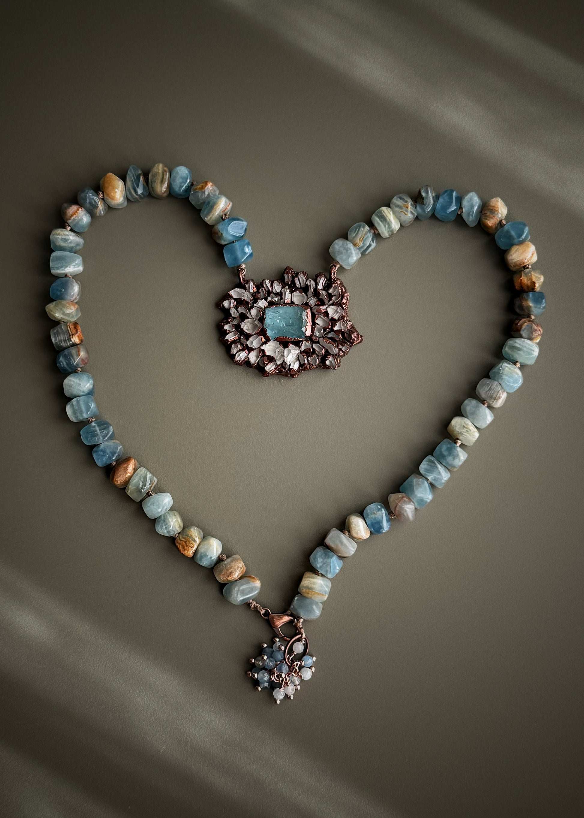 Girocollo artigianale realizzato con pepite sfaccettate di calcite blu naturale annodate a mano, pensate per sostenere un importante ciondolo centrale in rame.