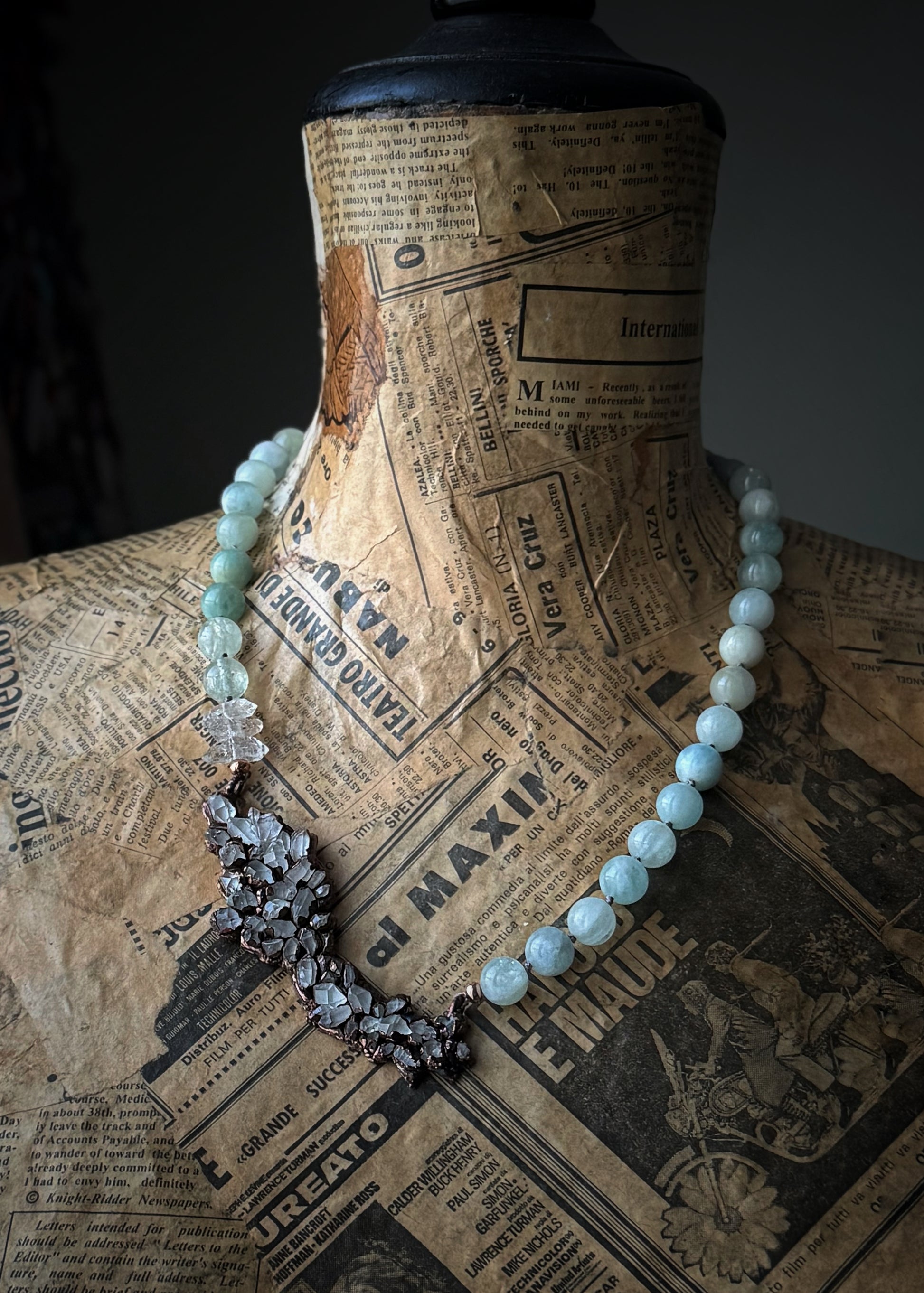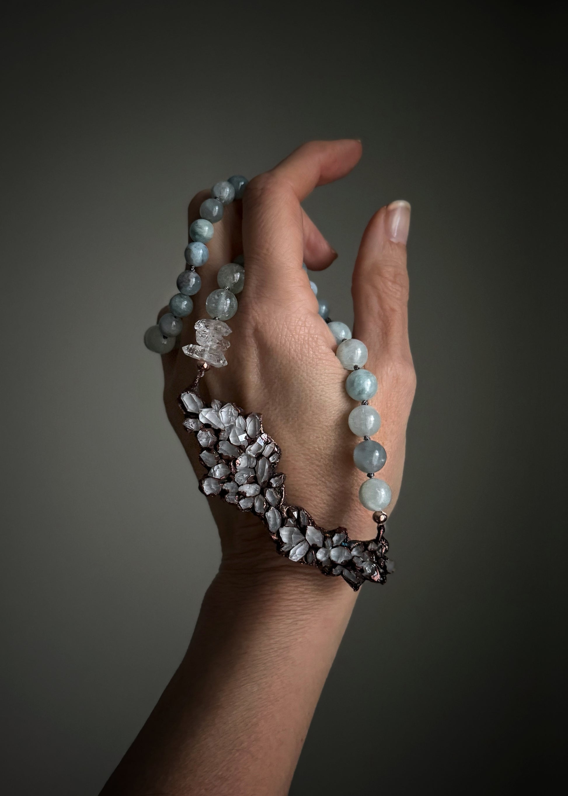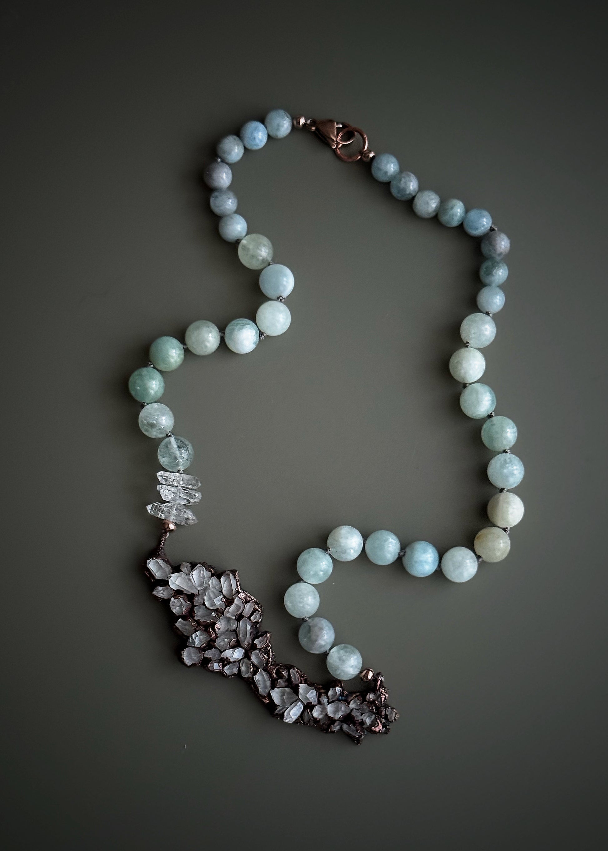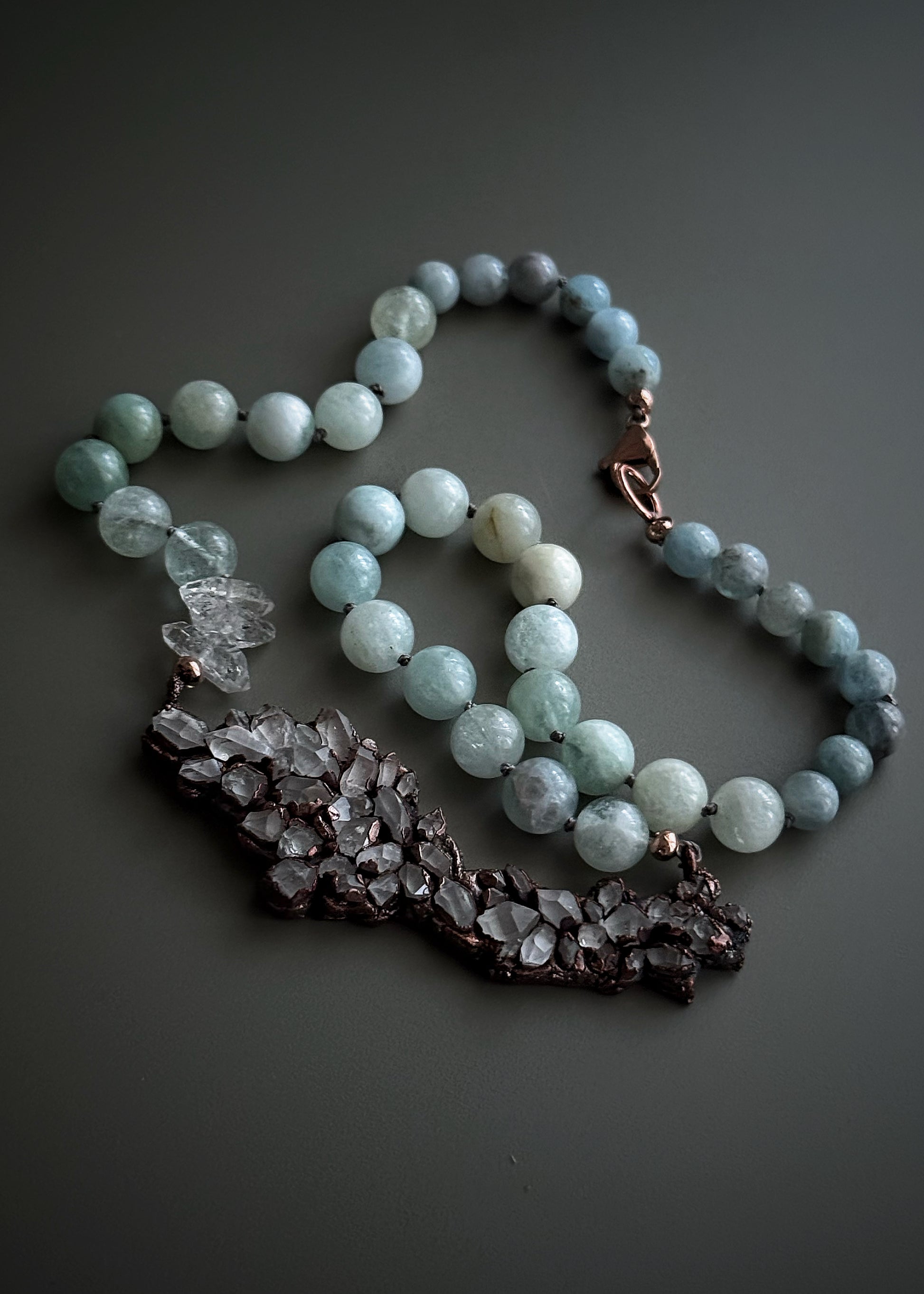 Collana in rame con quarzi Herkimer e acquamarina