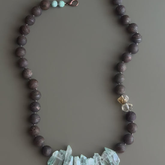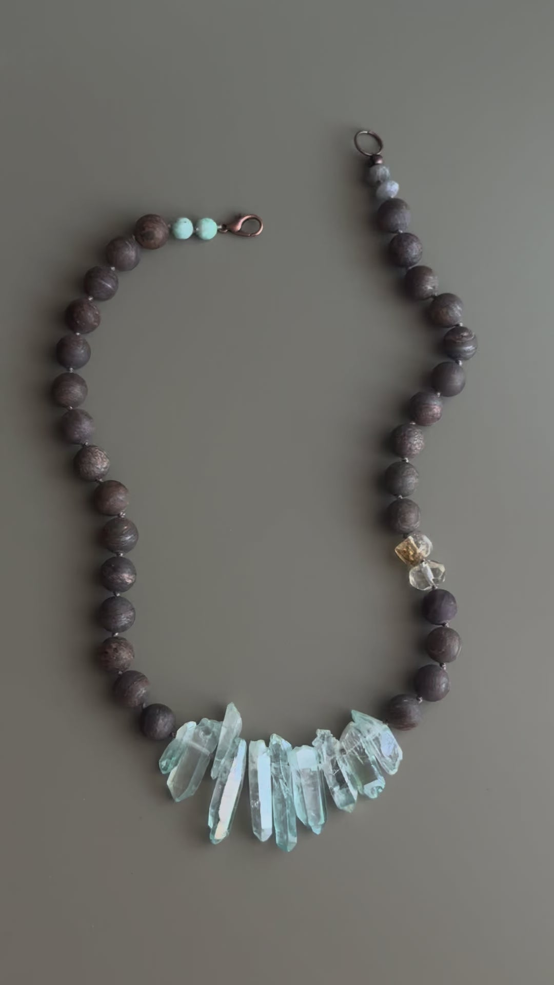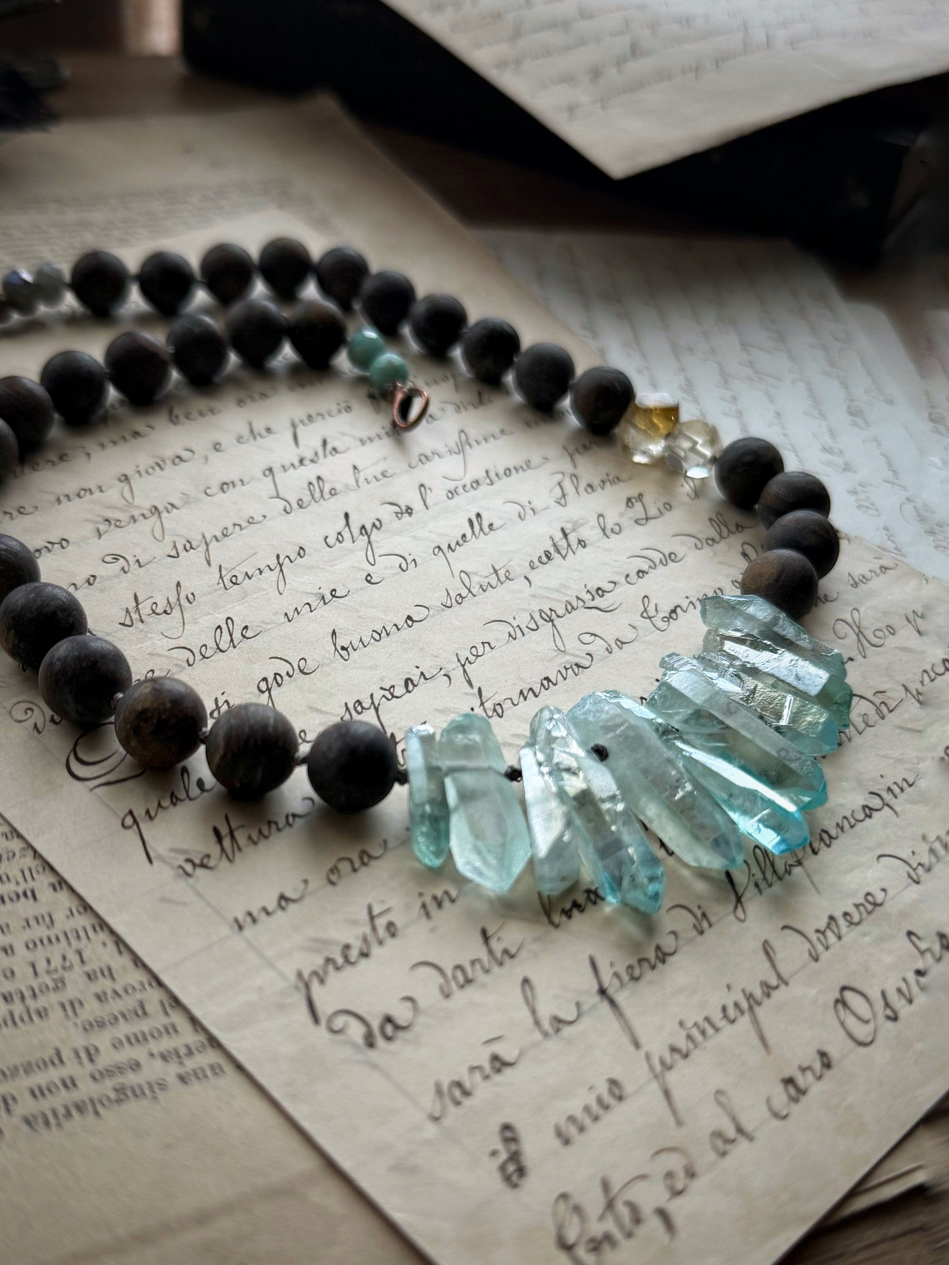 Una collana che celebra il contrasto tra ombra e luce, materia compatta e cristallo grezzo. Realizzata con pietre naturali selezionate, questo gioiello è pensato per essere indossato come elemento centrale, non come semplice ornamento.