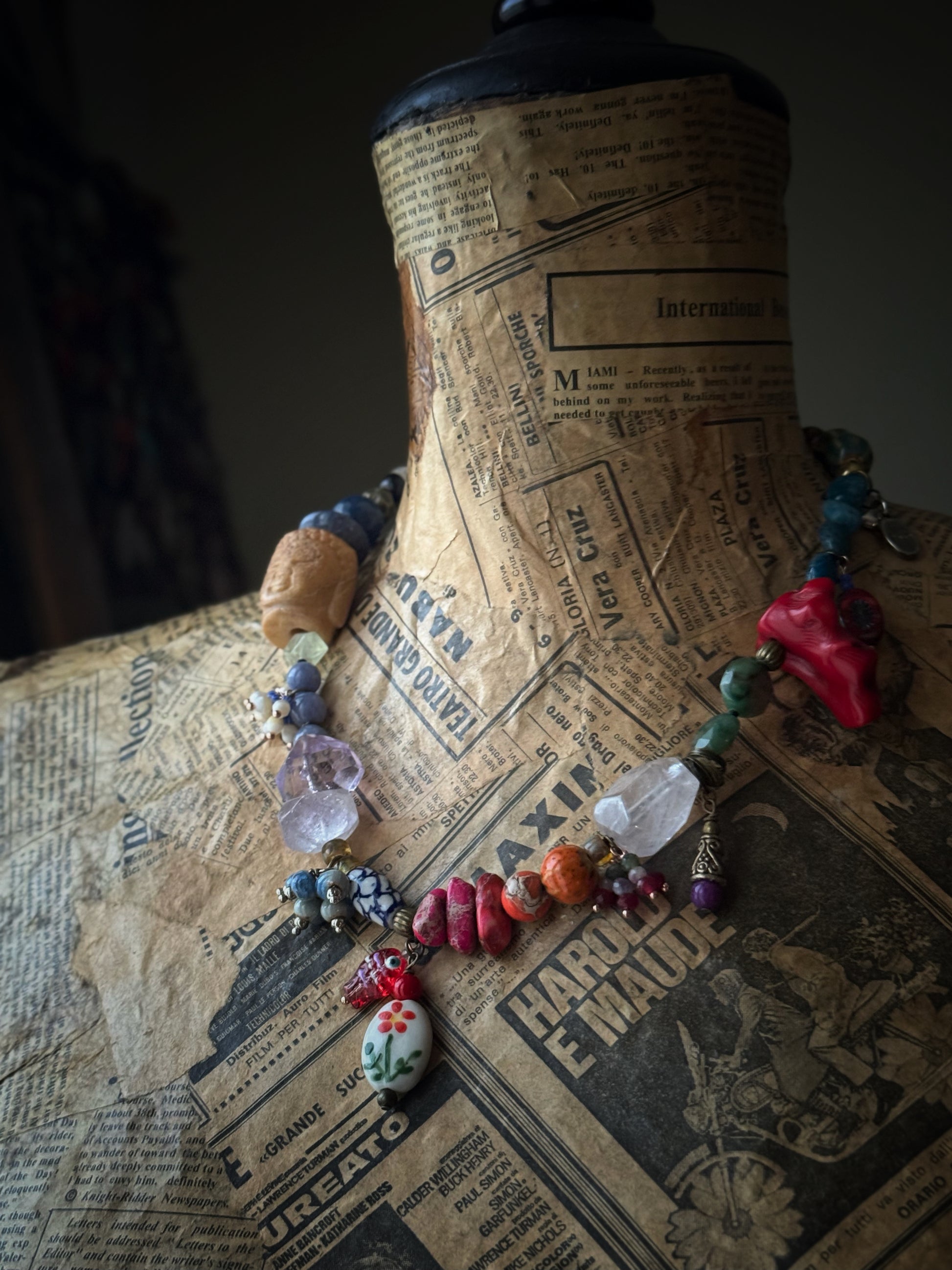 Girocollo realizzato a mano con pietre naturali, quarzi, elementi in vetro, corallo... un gioiello unico e autentico.