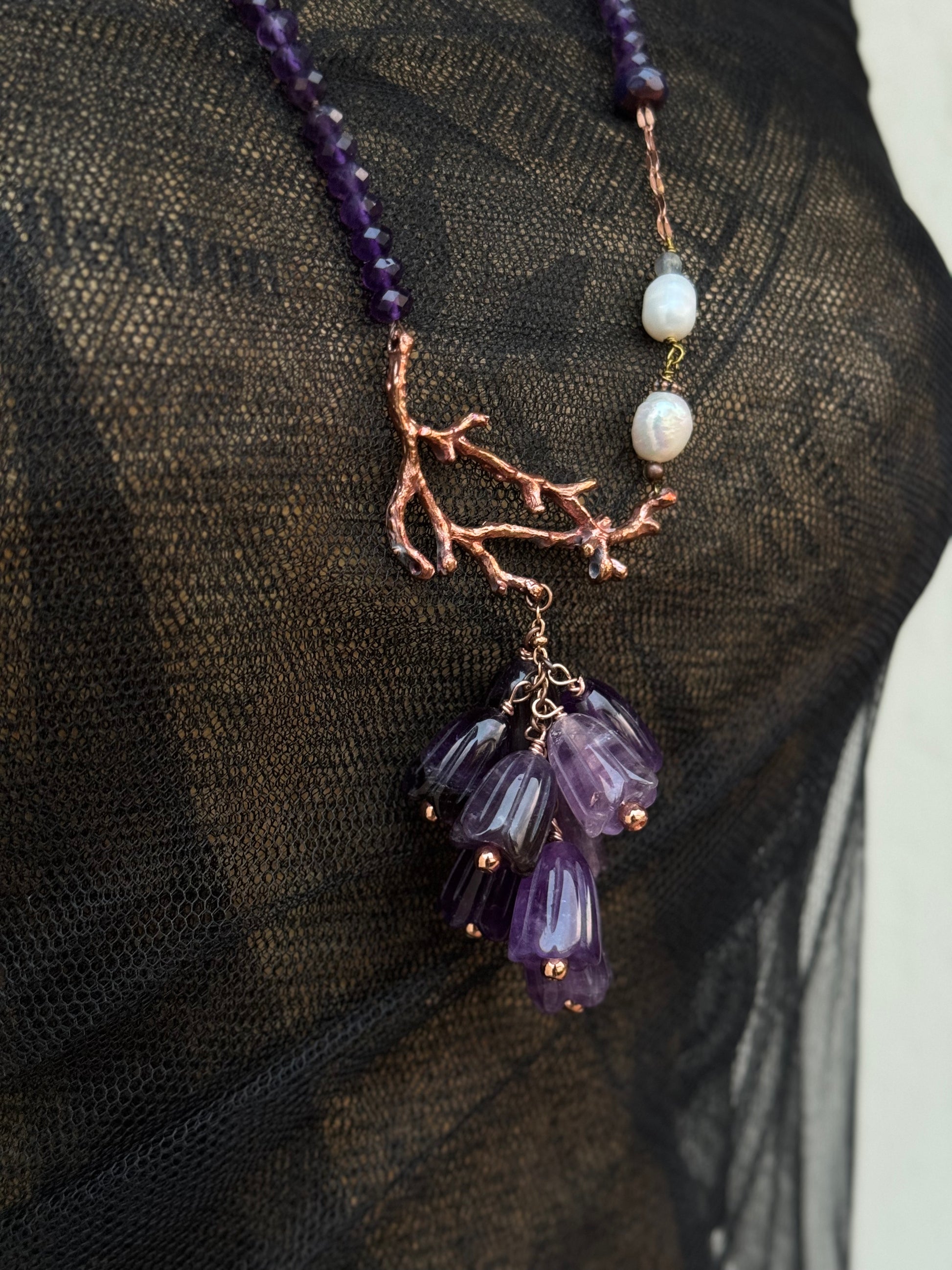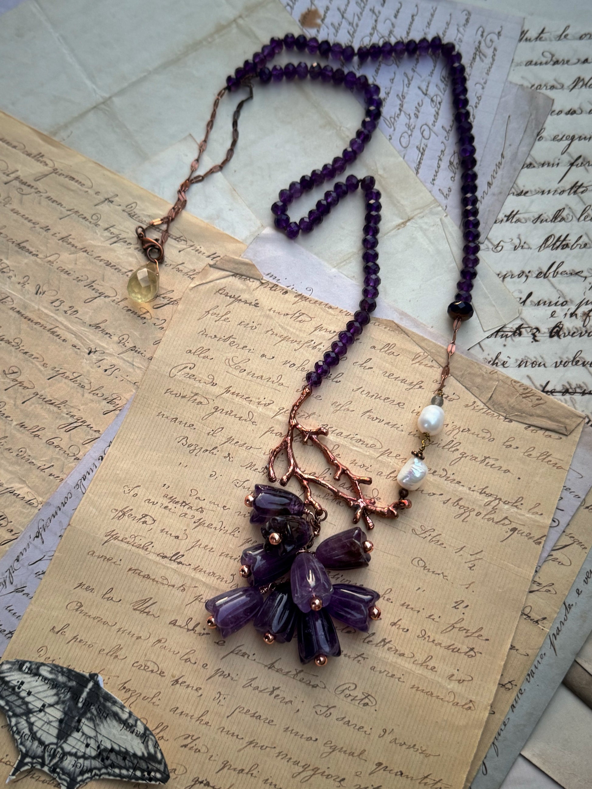 Collana realizzata con pietre di ametista sfaccettata. Un ramoscello in rame accoglie un grappolo di nove campanule scolpite in ametista. La collana è arricchita da due perle naturali e si chiude con una piccola goccia di quarzo citrino, posta vicino alla chiusura come dettaglio prezioso.