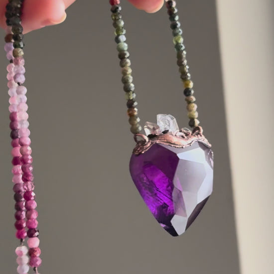 Un gioiello sacro che unisce spiritualità e bellezza naturale. Questa collana artigianale presenta un ciondolo ex voto a forma di sacro cuore in ametista viola, impreziosito da diamanti di Herkimer che catturano la luce con brillantezza cristallina.