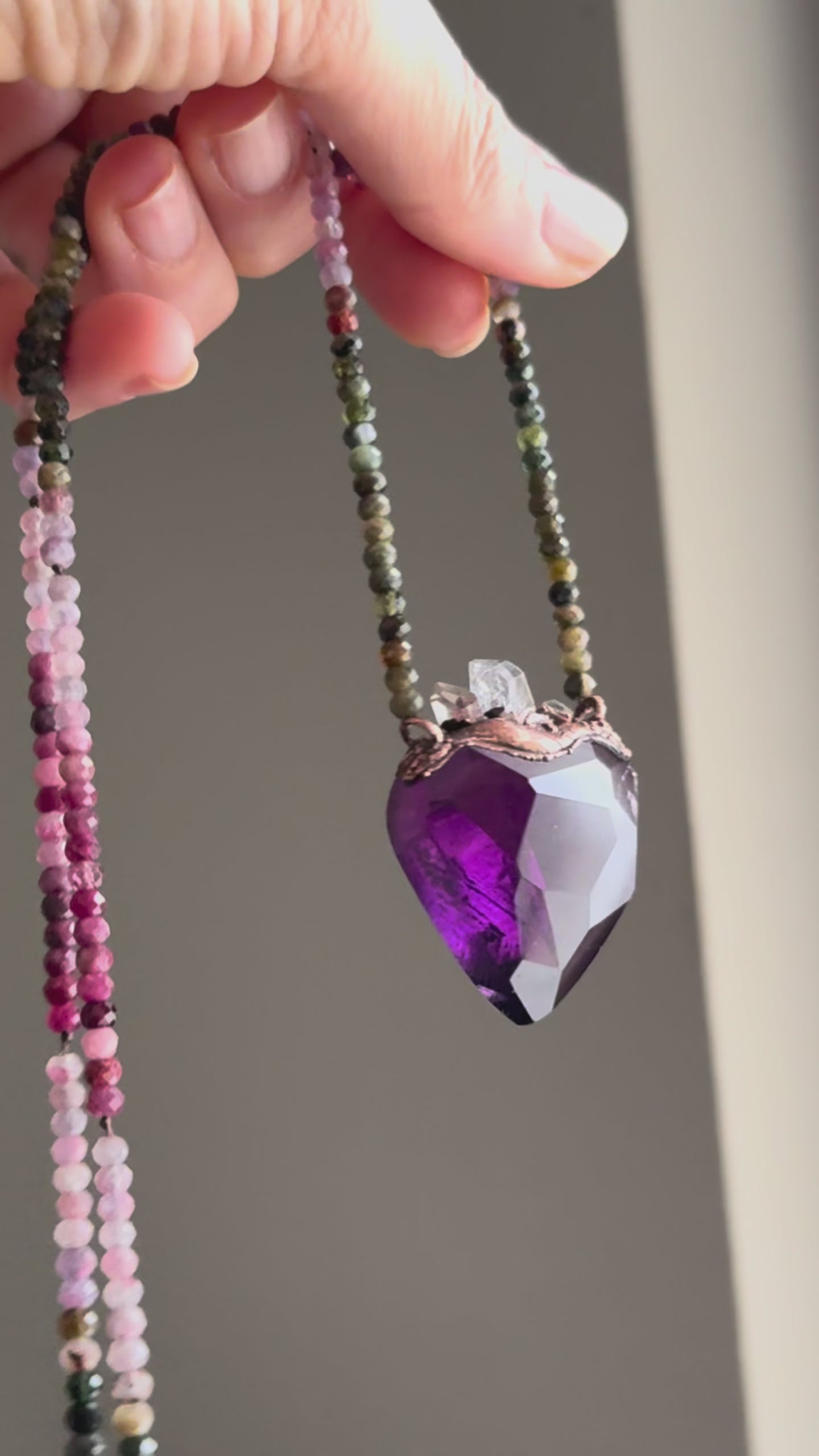 - Materiali: Ametista naturale, Tormalina multicolore, Diamanti di Herkimer, Fluorite