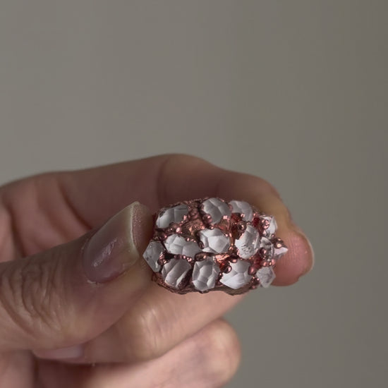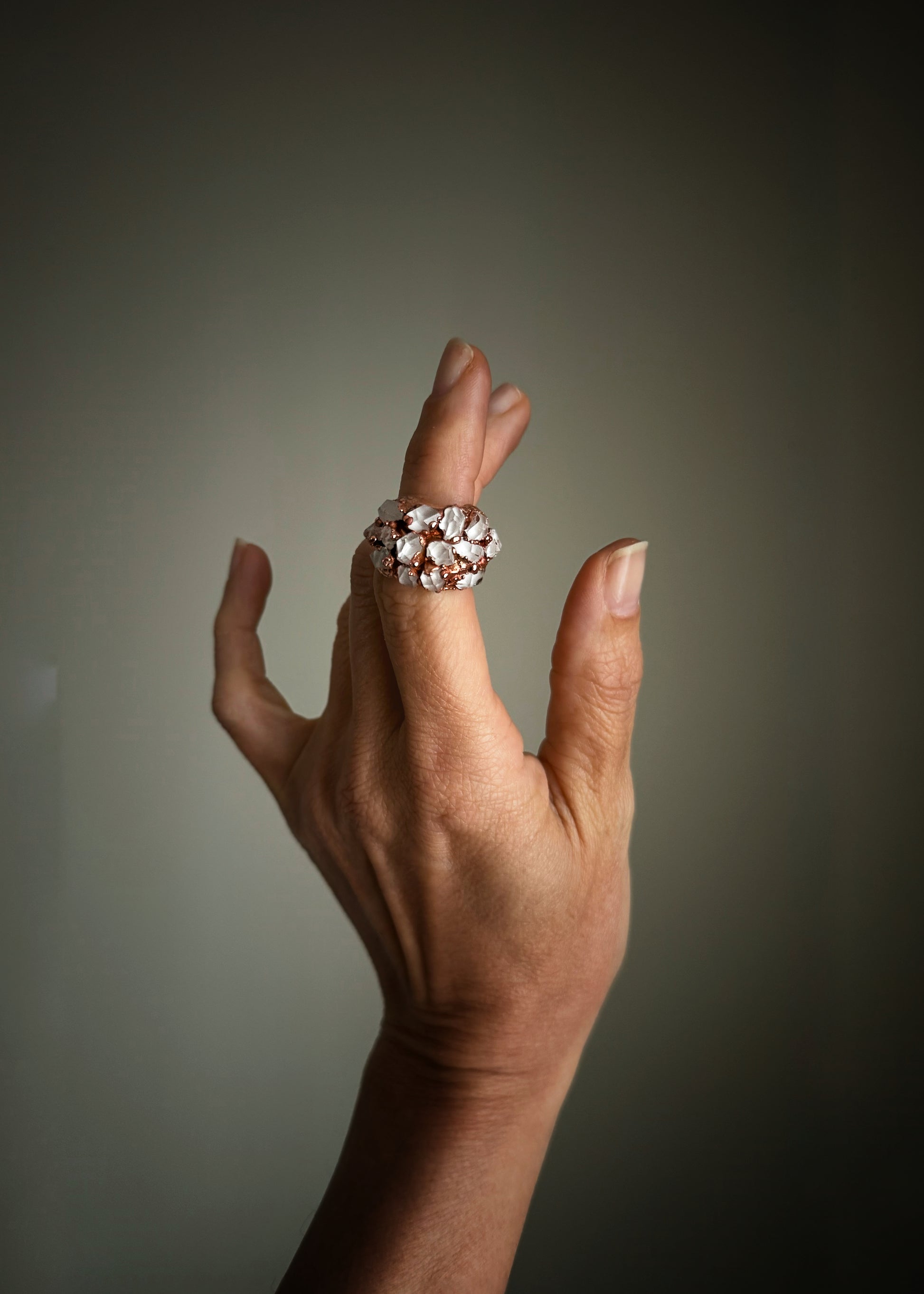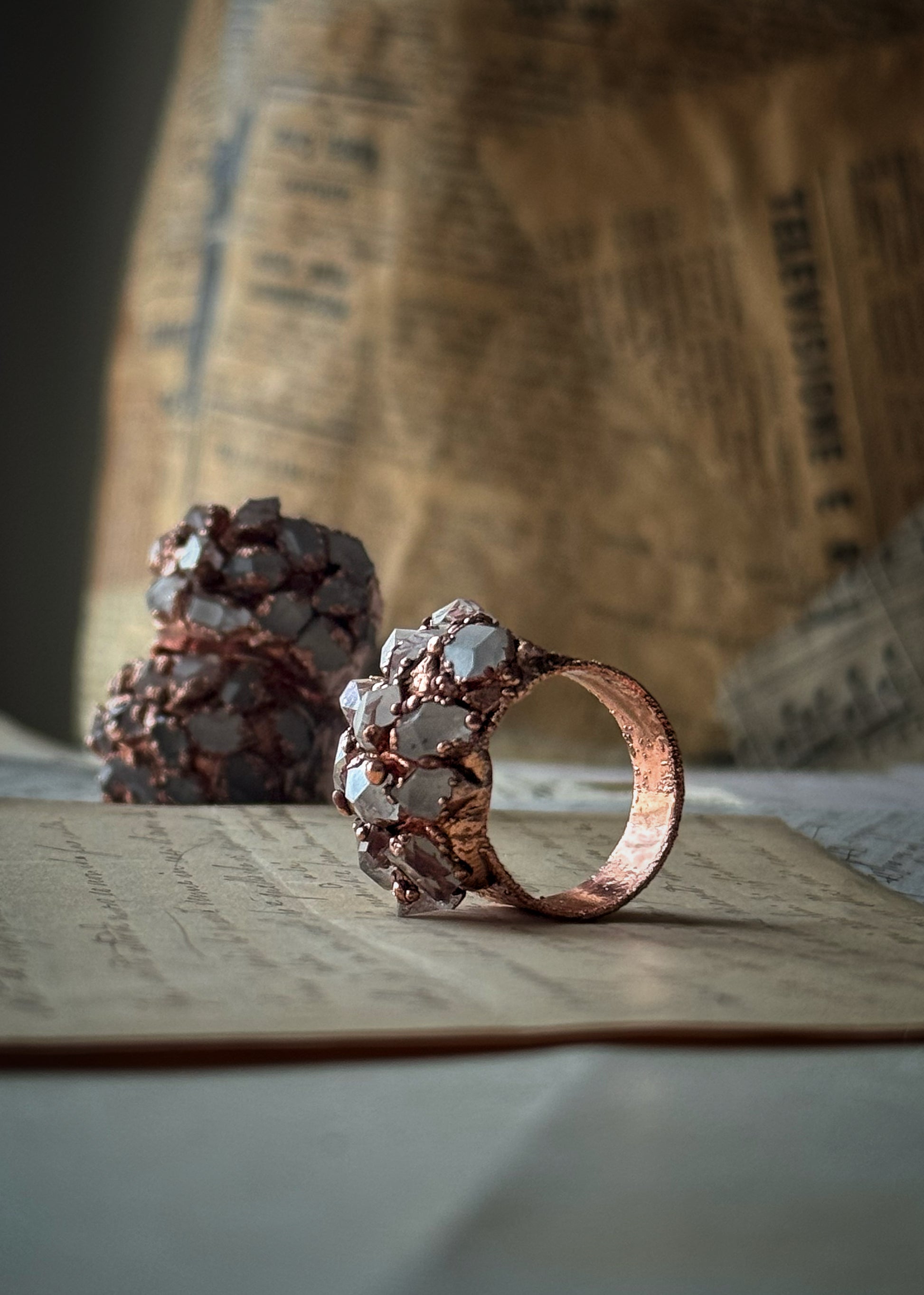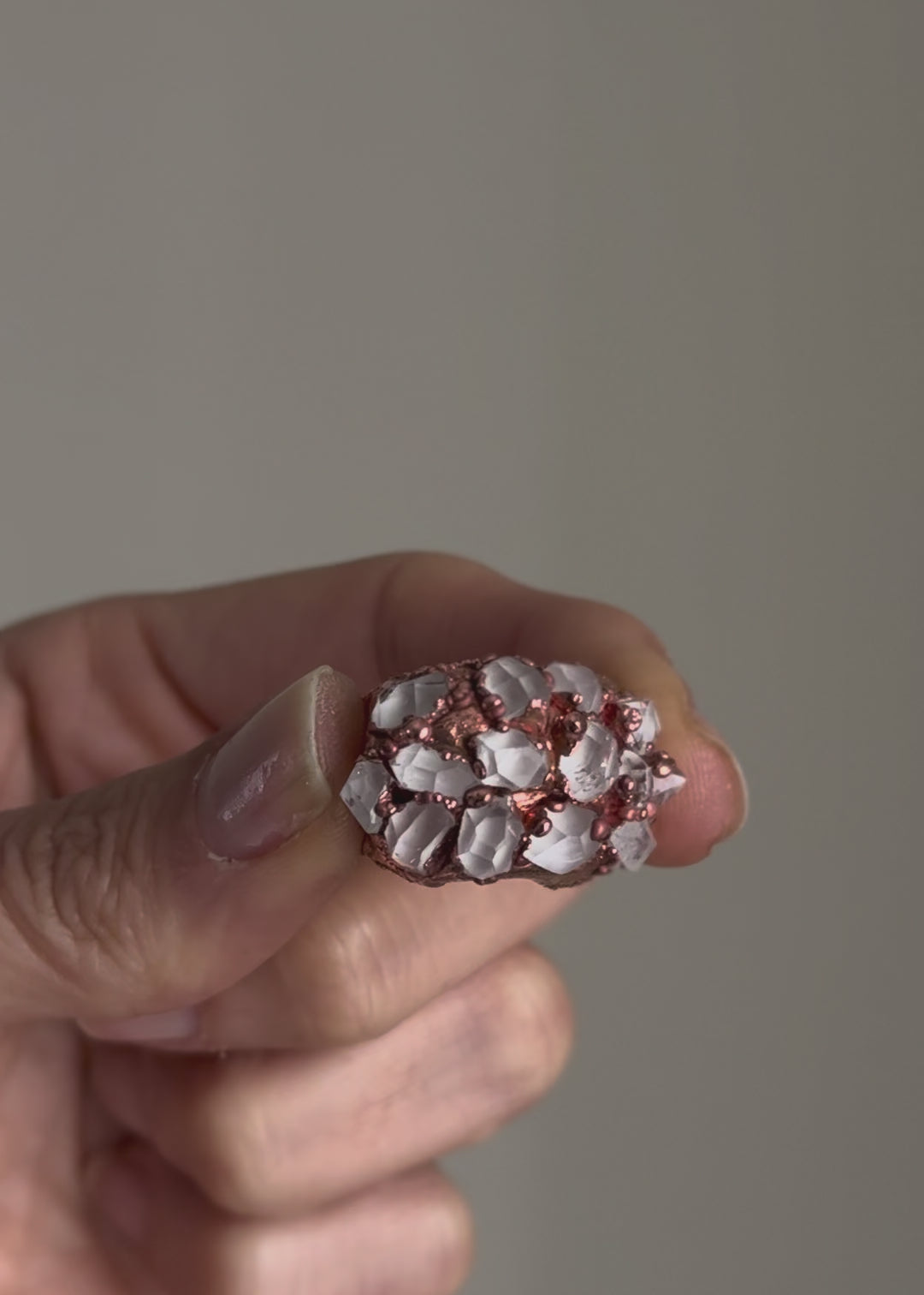 Questo anello a fascia larga è impreziosito da tredici quarzi di Herkimer grezzi, incastonati e placcati in rame elettroformato con tecnica artigianale. Ogni pietra è irregolare per natura: nessun anello è uguale all'altro.