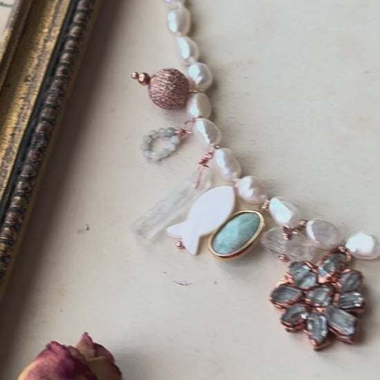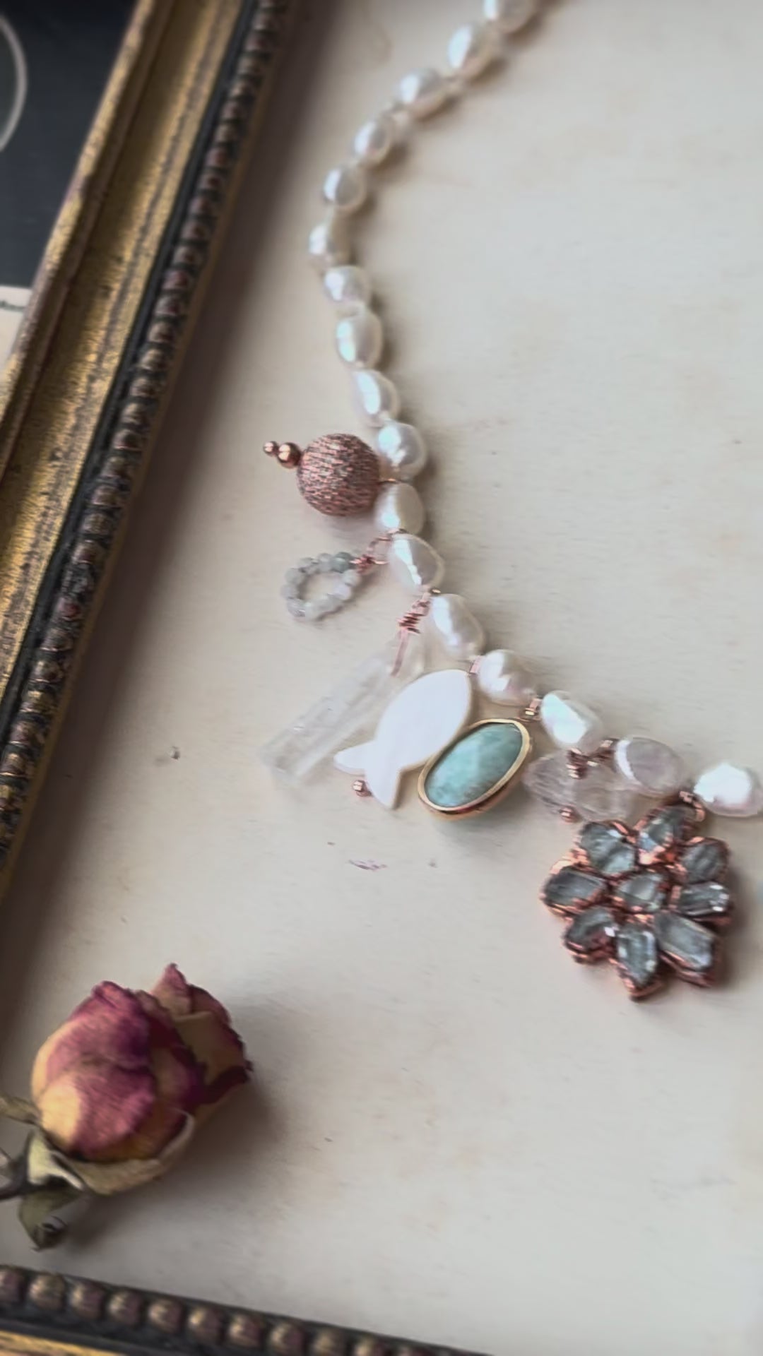 • Realizzata interamente a mano, combina perle infilate singolarmente con cura e 13 ciondoli in rame, oro rosa e pietre ( perle barocche, quarzi, acquamarina, madreperla, herkimer e fluorite).