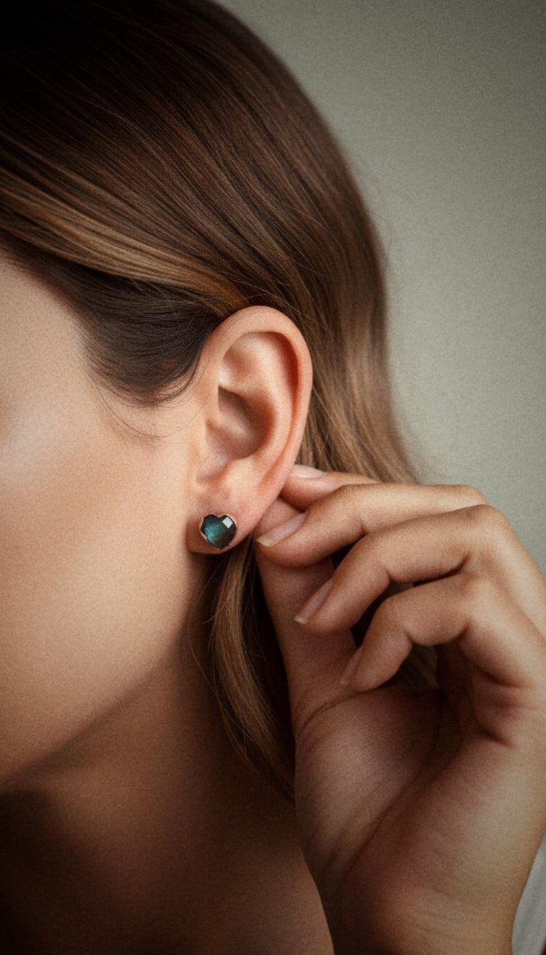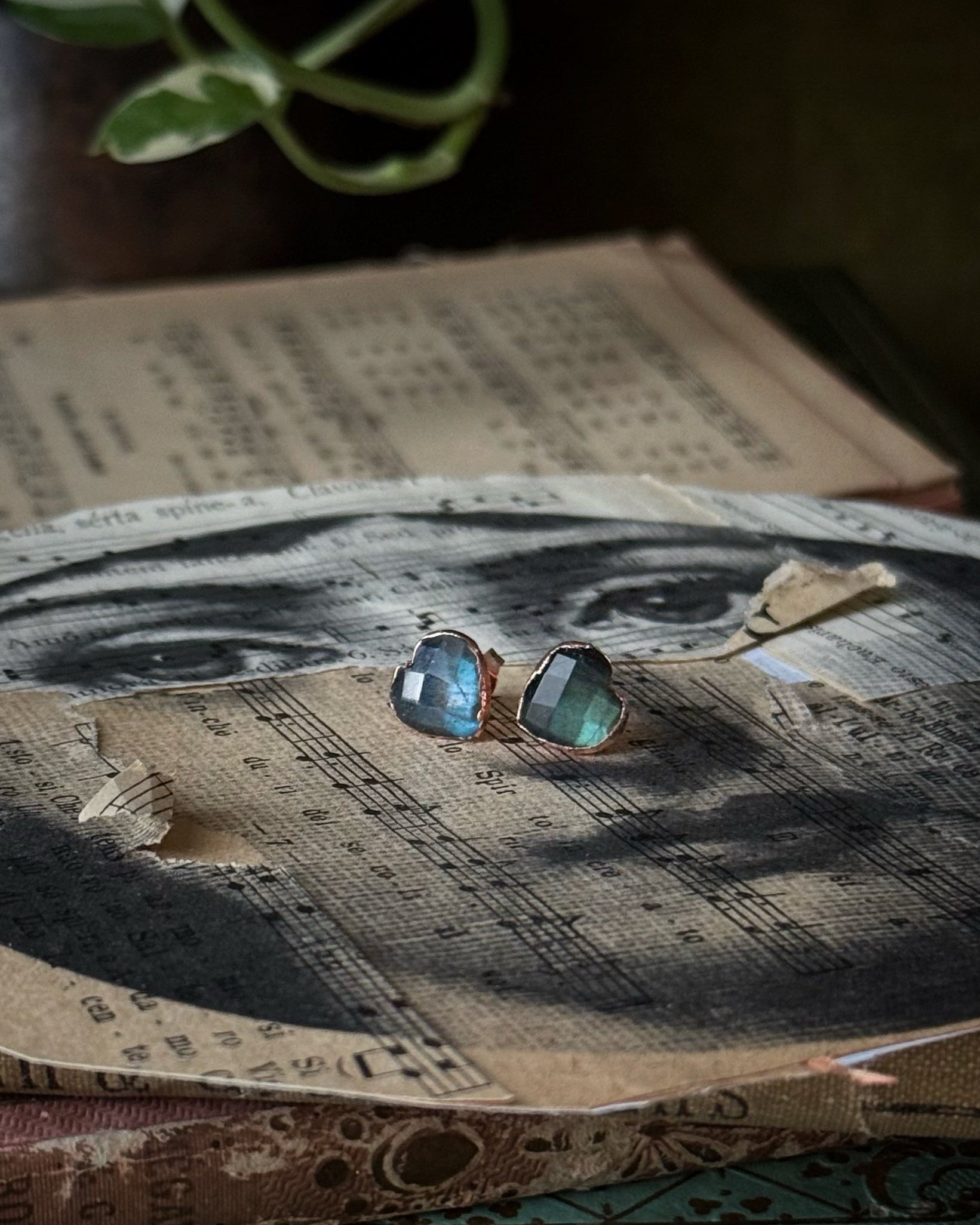 Eleganti e leggeri, questi orecchini sono realizzati a mano con piccoli cuori sfaccettati di Labradorite verde con riflessi oro e blu, incastonati in rame attraverso un processo di galvanizzazione. Il perno è placcato in oro rosa, per un tocco raffinato e delicato sulla pelle.