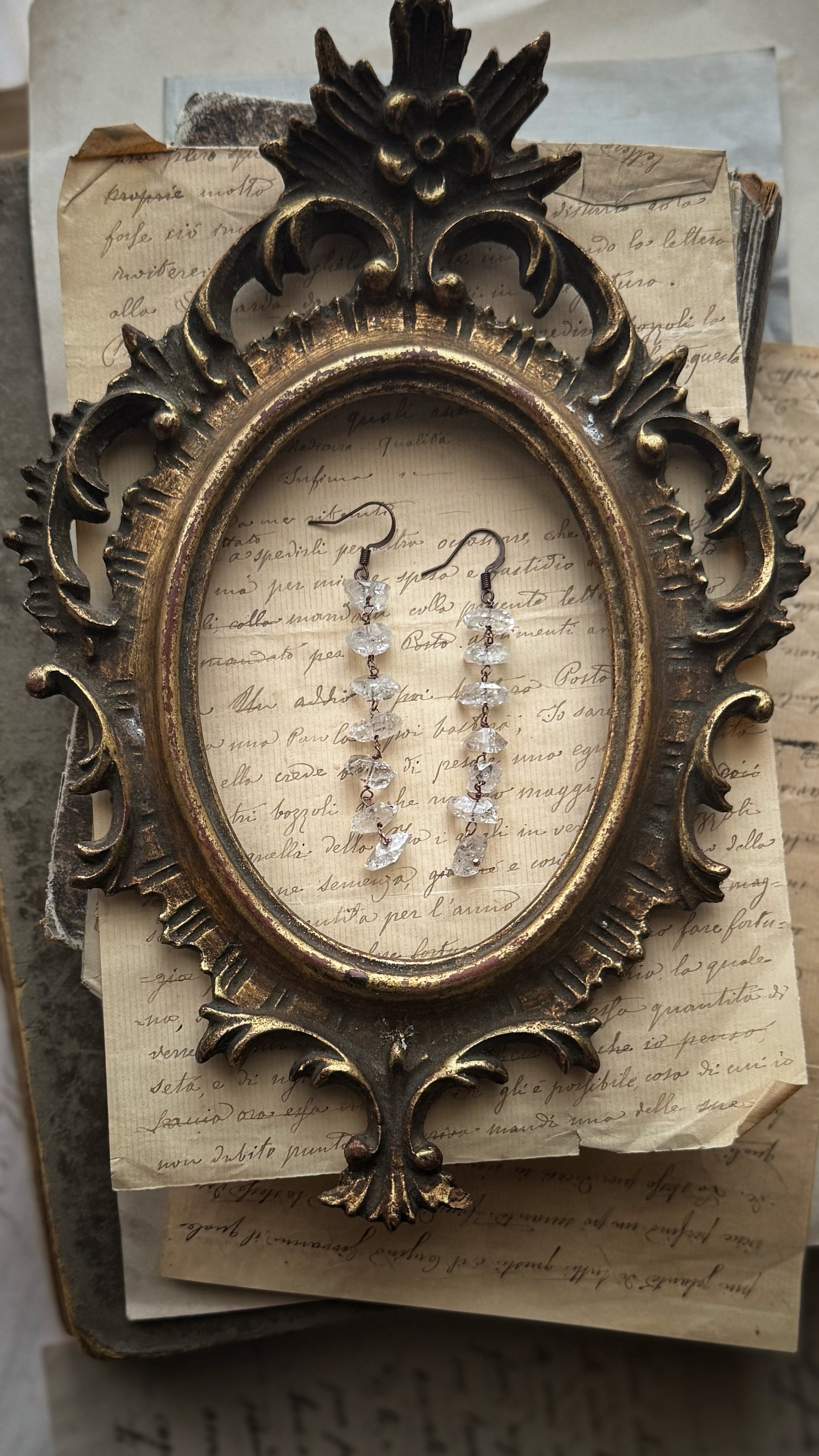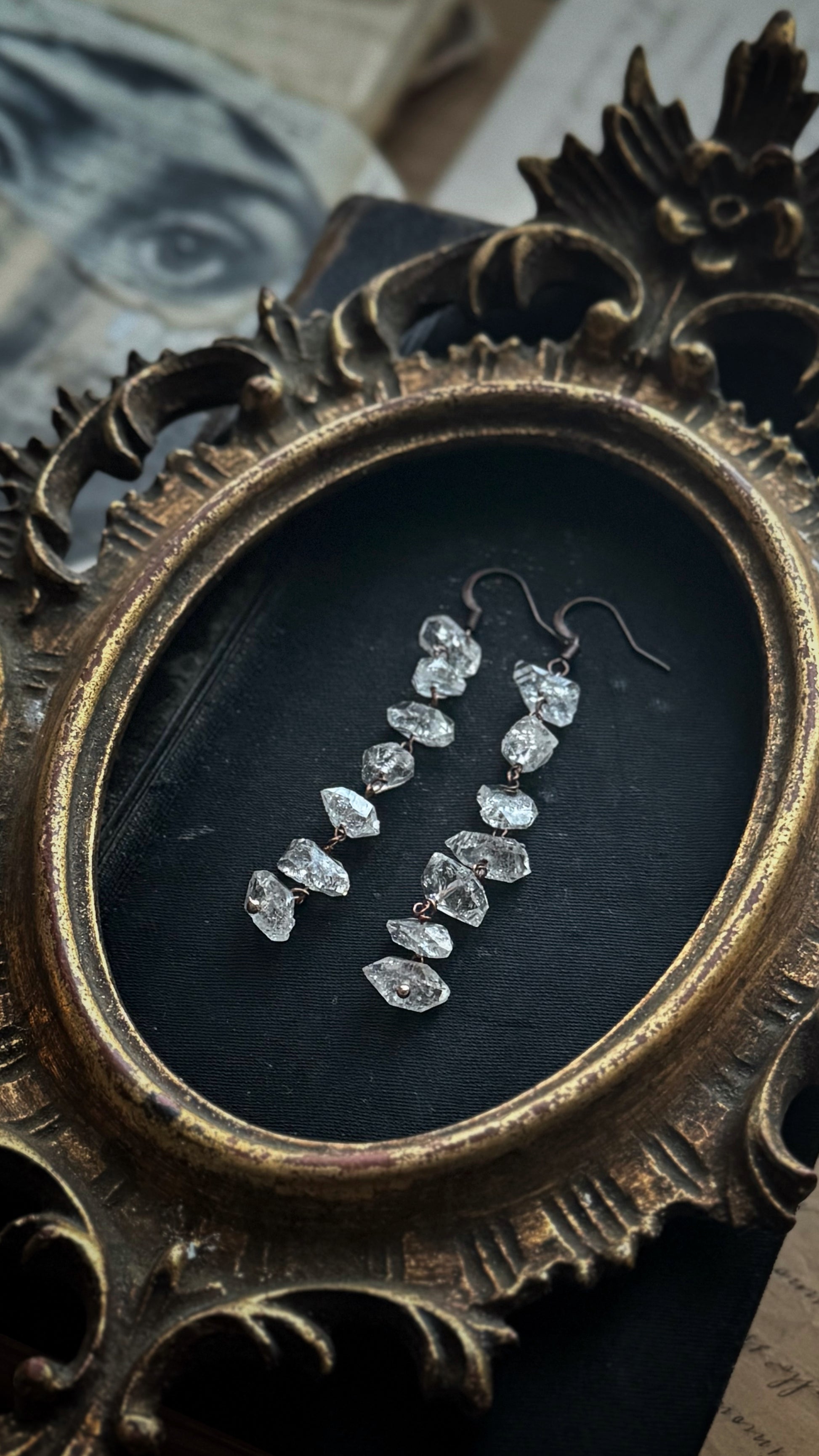 Questi orecchini sono realizzati a mano con diamanti grezzi di Herkimer biterminati, infilati a mano con tecnica a rosario. Ogni orecchino è realizzato sette pietre ognuna diversa dalle altre.